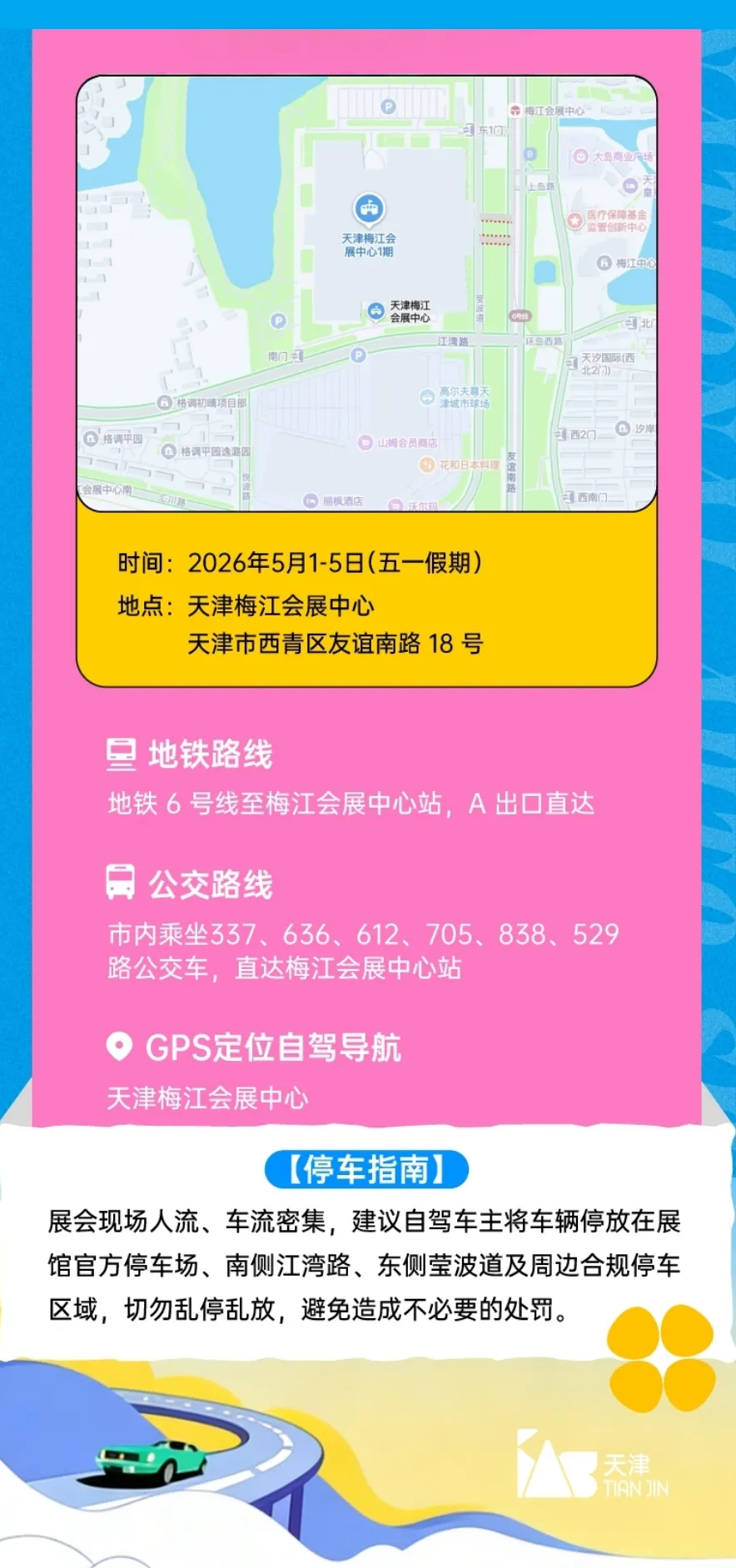 2026天津国际汽车交易会(也称“天津五一汽车嘉年华”)已正式启动,响应全国两会 “汽车产业高质量发展” 号召,落实天津 “智能网联汽车产业升级” 部署,以“津彩五一,智慧同行”为主题,将于5月1-5 日在天津梅江会展中心盛大举办。本届车展以“规模升级、体验优化、惠民优惠”为宗旨,打造集赏车、购车、亲子、休闲于一体的五一专属汽车盛会,成为假期家庭出游优选目的地。