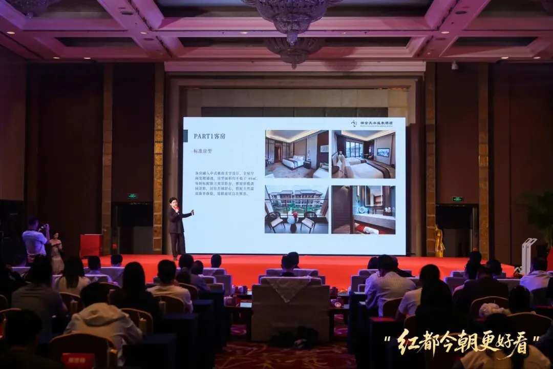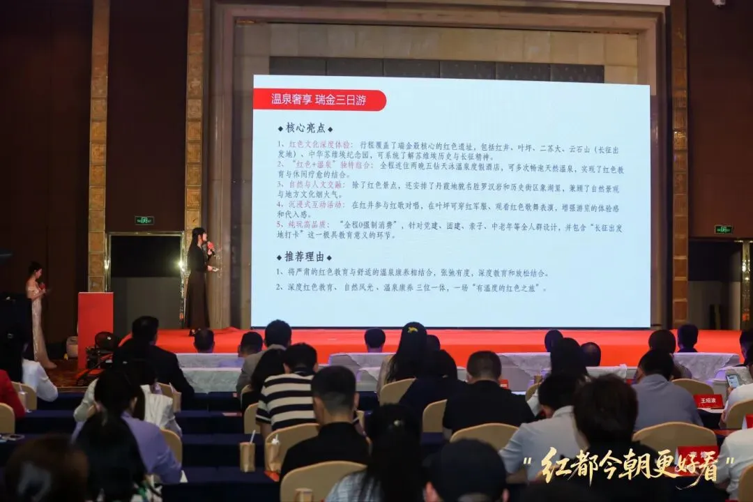 推介会现场亮点纷呈。瑞金天沐温泉度假酒店作为五钻级度假新地标,就其酒店产品与服务进行了专题推介。酒店建筑巧妙融合宋氏典雅与客家质朴,匠心打造住宿、温泉、餐饮等多元业态,以“红色研学+温泉康养”为主题,为游客打造白天追寻革命足迹、夜晚浸泡天然汤泉的全新度假体验,生动呈现红色文化与生态康养深度融合的瑞金样本。福建清新假期国际旅行社有限公司精准推介瑞金旅游精品线路,为福州市民量身定制灵活多样的赴瑞旅游优质方案:线路一为“寻根筑梦”瑞金二日游,串联叶坪、红井、二苏大、象湖里文化街区及罗汉岩等核心景区,实现红色教育与自然景观深度融合;线路二为“温泉奢享”瑞金三日游,在深度体验红井、二苏大、叶坪等革命旧址群基础上,搭配五钻天沐温泉度假酒店,形成“红色研学+生态康养”的特色行程。两条线路均融入红歌对唱、沉浸式体验等互动环节,配有完善的交通、住宿及导游服务,满足不同群体需求,全方位展现瑞金作为“共和国摇篮”的深厚历史底蕴与新时代文旅魅力。