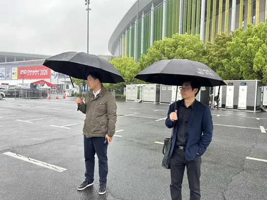 集团总经理张劼(左一)与大众租赁公司领导冒雨在国展中心现场