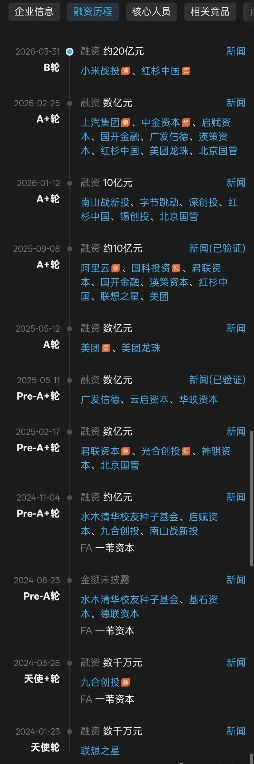 不到四个月前,自变量刚完成由字节跳动领投的10亿元A++轮融资;再往前,美团和阿里分别在A轮和A+轮领投。在2026年一季度,这家公司密集完成了A++轮、数亿元追加融资和B轮三轮大额融资,累计融资金额超过30亿元。