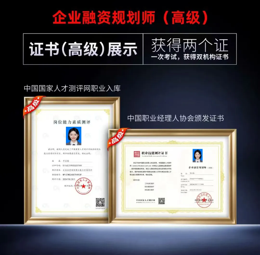 中国职业经理人协会是经中央社会工作部批准、民政部直接管理的国家一级行业协会,本次企业融资规划师证书,由协会权威颁发,中国国家人才测评网同步出具专业测评报告,职业信息录入全国人才职业能力素质评价库,双官网可查、全国通用、行业认可度极高。