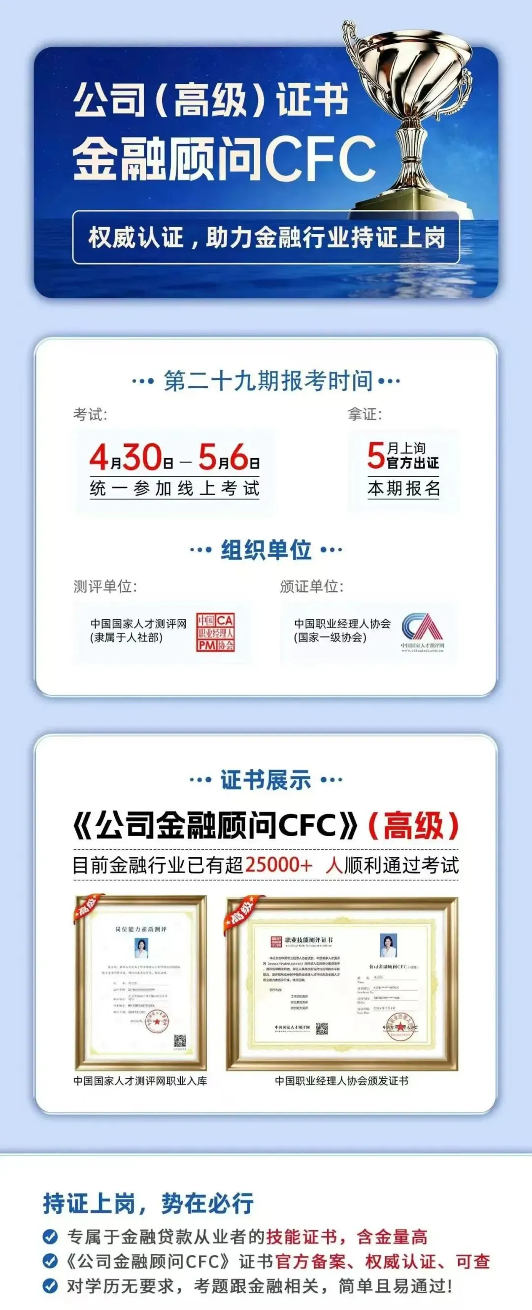 手握权威职业证书,夯实专业服务能力,抢占企业金融蓝海市场,合规拓业、稳步增收,实现职业全方位提升。