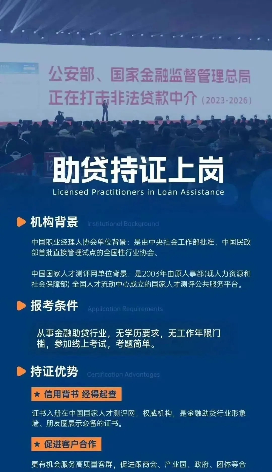 持证可以有效规范从业经营,提升客户信任度,摆脱行业不正规标签,轻松对接政企资源、园区商会、企业客户。不管主业升职加薪,还是拓展金融副业、开展融资咨询业务,都十分实用。