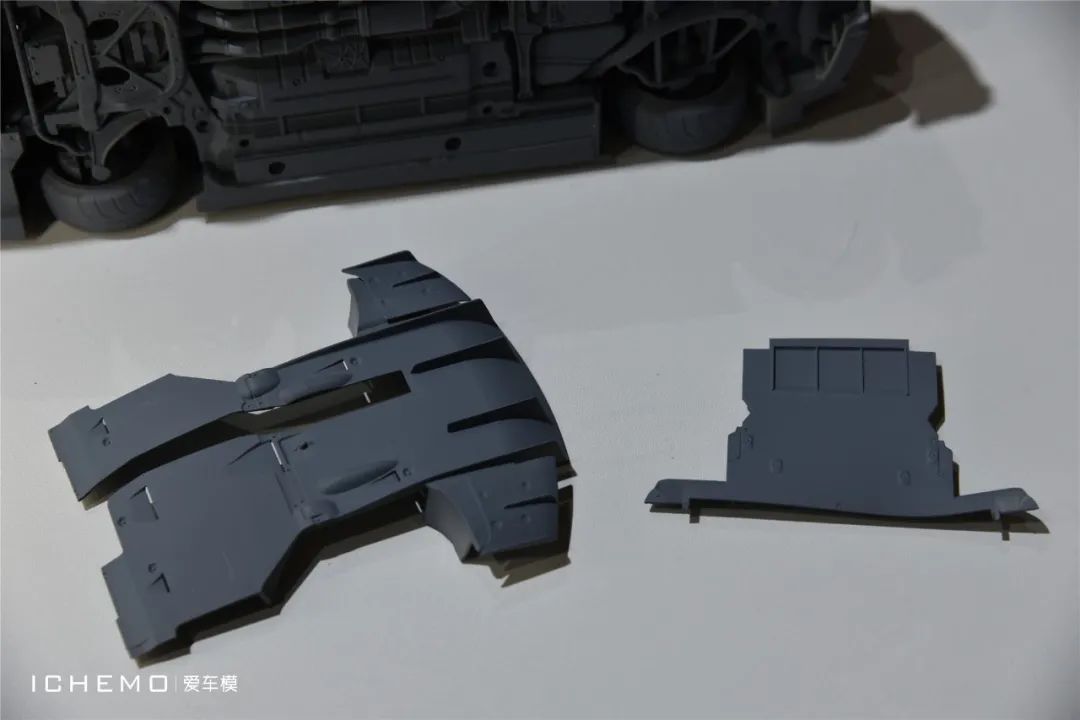 模型底盘前/后护板件可取下,然后可见更多细节配置。目前底盘部分可动功能未完成设置,可参考分件结构。