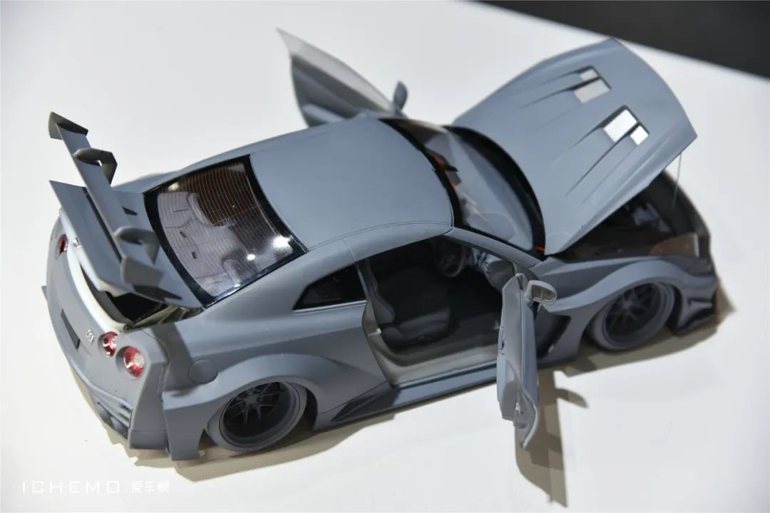 在 2023 HEC 中国国际模型博览会 MotorHelix 展台上展示的 MotorHelix 1:18 合金全开工艺 LB-Silhouette WORKS GT Nissan 35GT-RR 灰模样品。