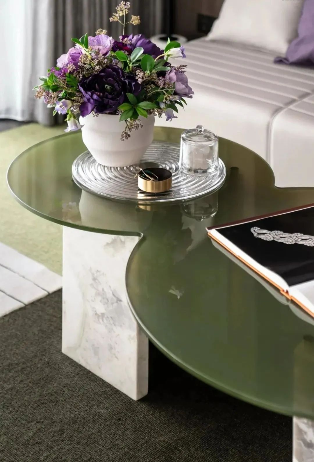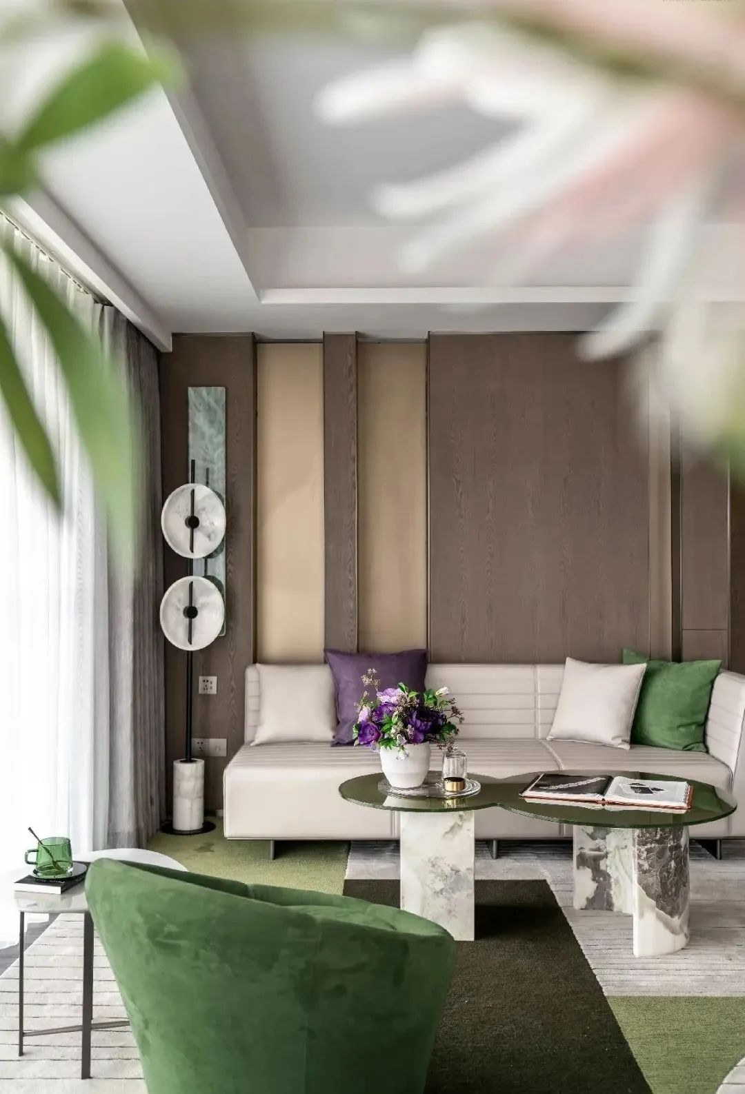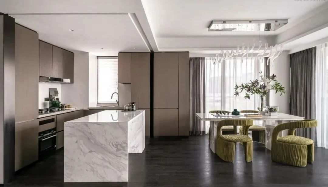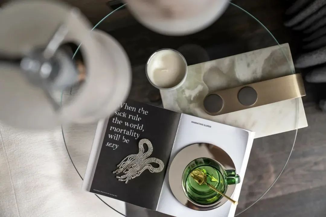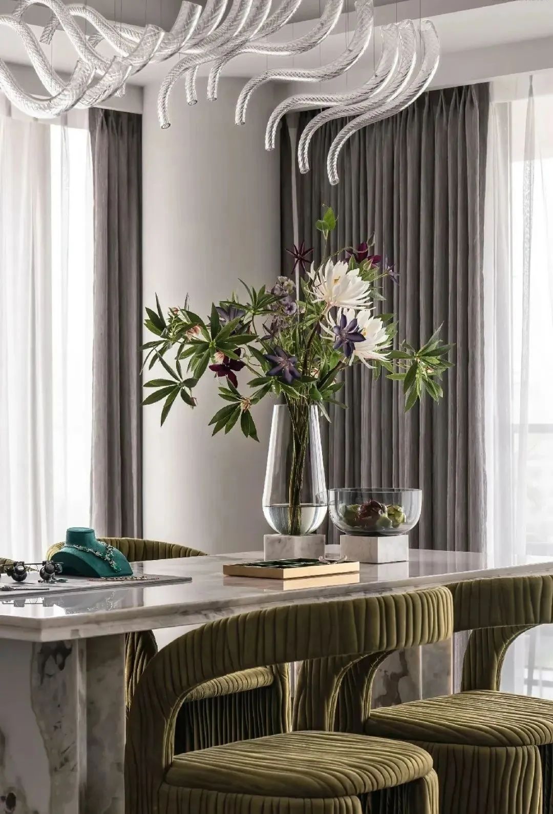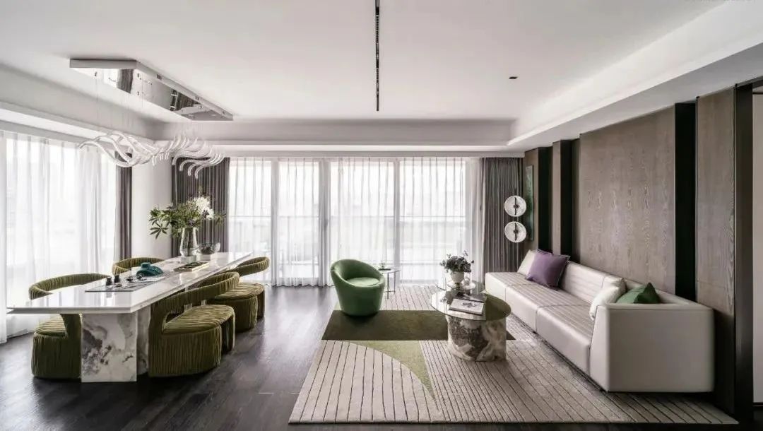 设计师的落笔,奠定在对居者感官想象的调动上。柔软而富有肌理感的墨绿绒面、一株灿烂盛开的鲜花,伴着阳光透过轻薄的纱帘洒入室内,人们不禁于此时此景中,联想起原野与森林,摩登而诗意。