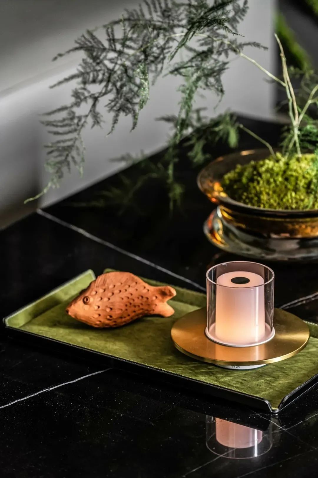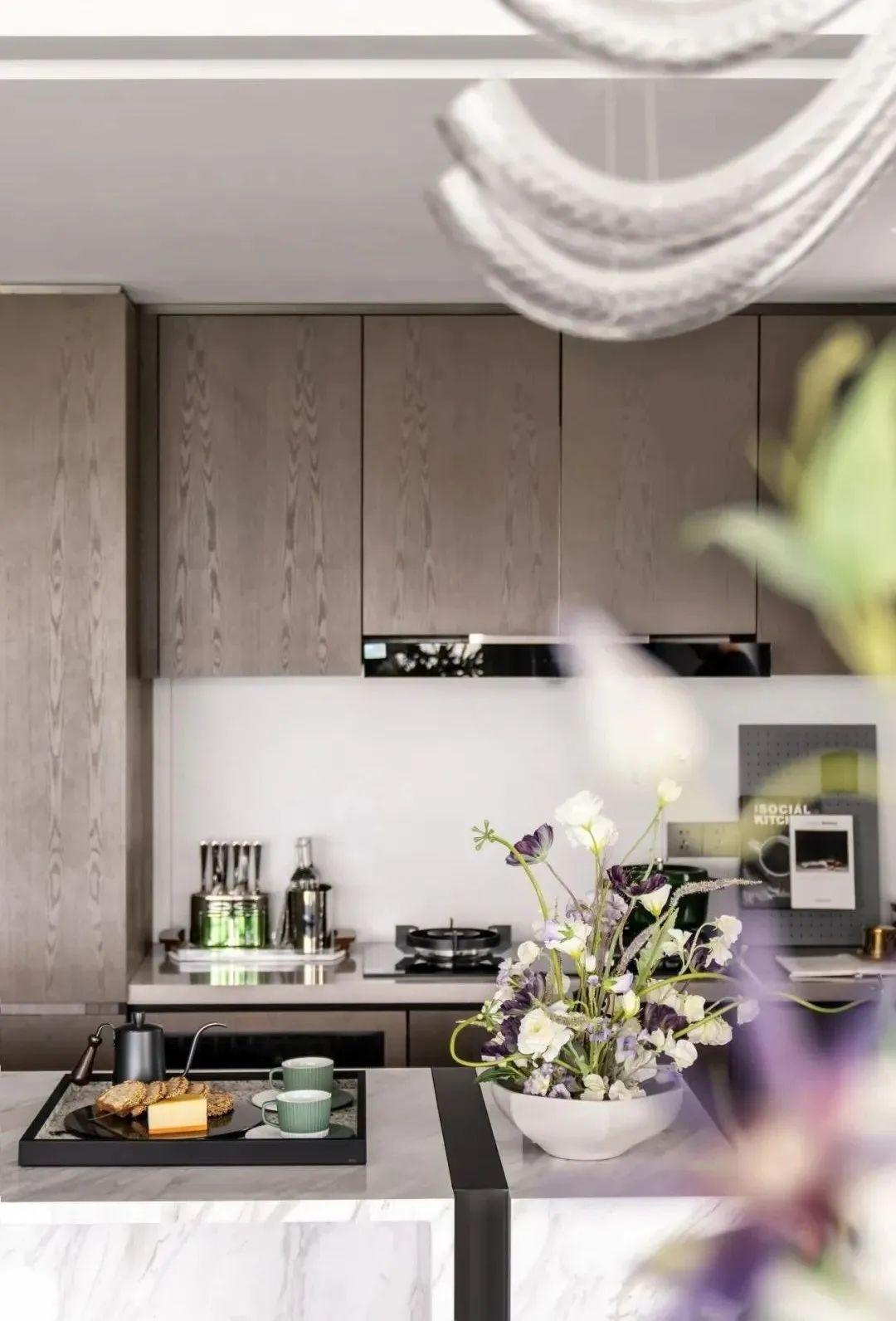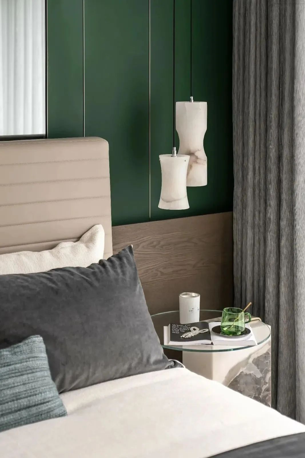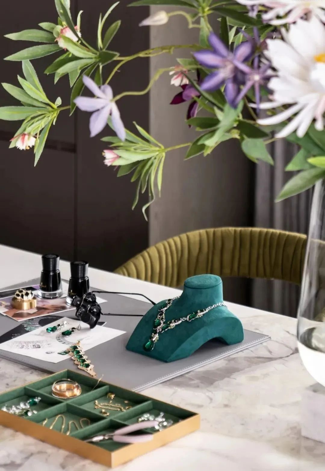 设计师的落笔,奠定在对居者感官想象的调动上。柔软而富有肌理感的墨绿绒面、一株灿烂盛开的鲜花,伴着阳光透过轻薄的纱帘洒入室内,人们不禁于此时此景中,联想起原野与森林,摩登而诗意。