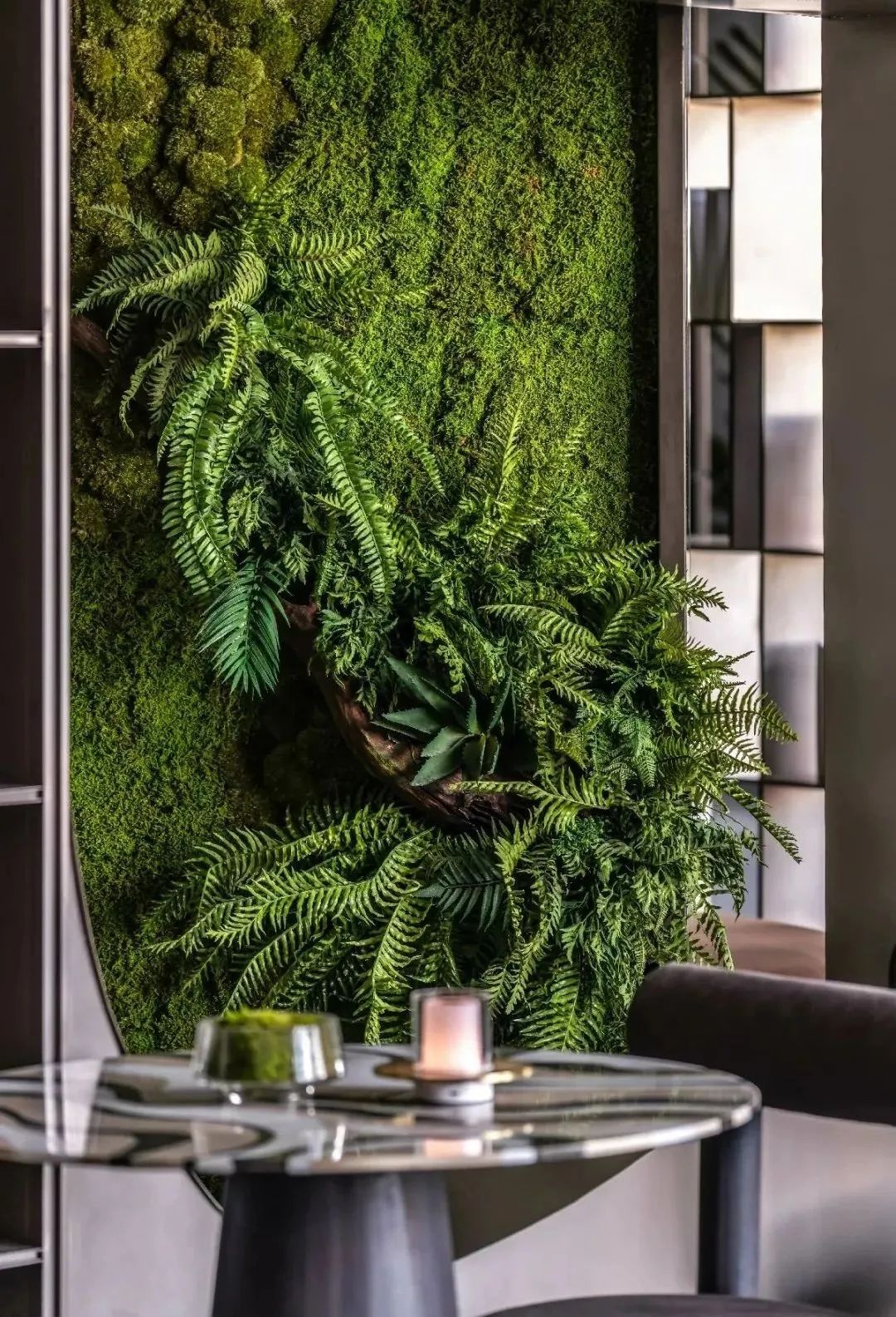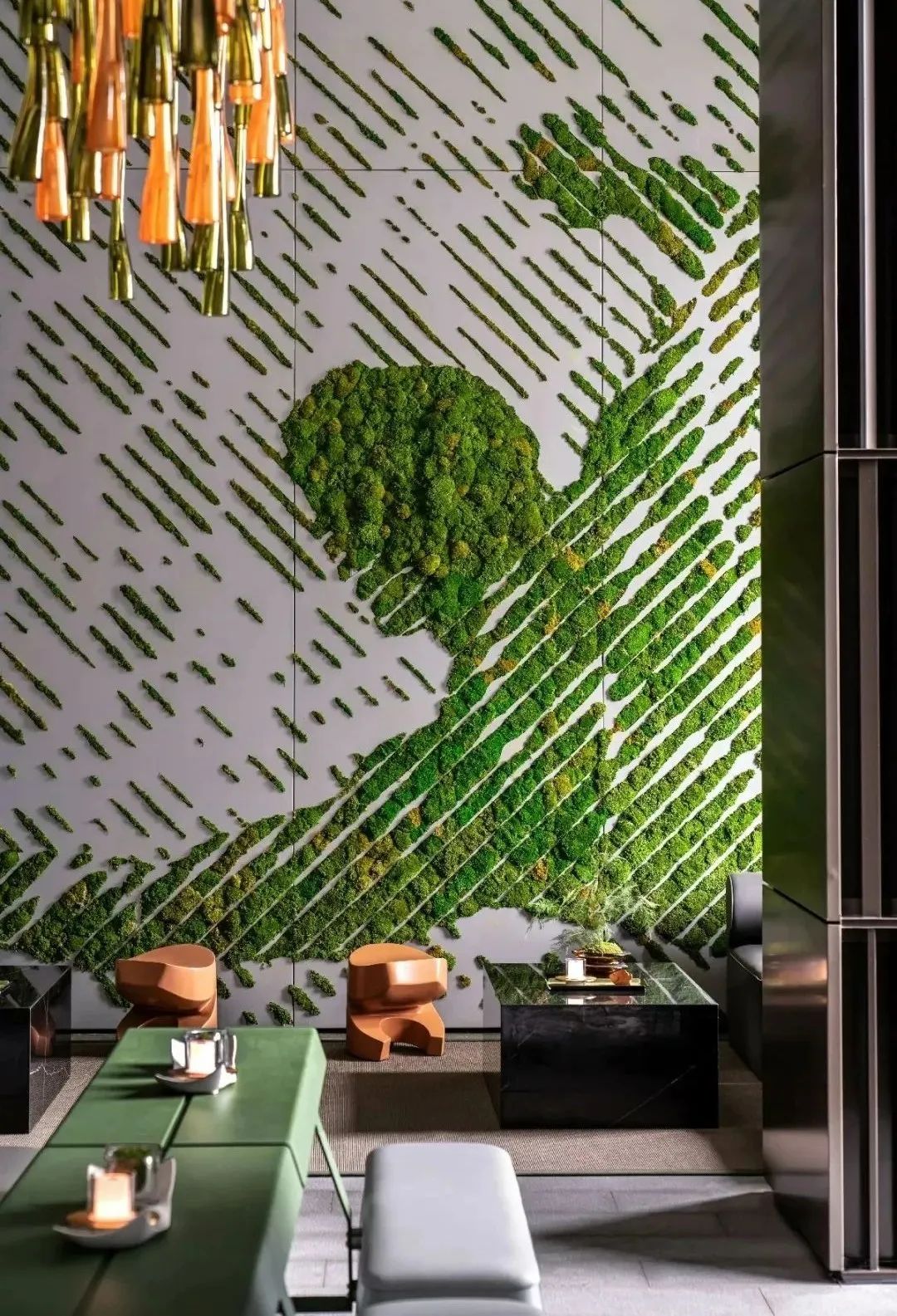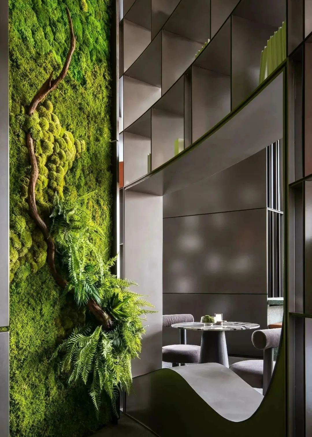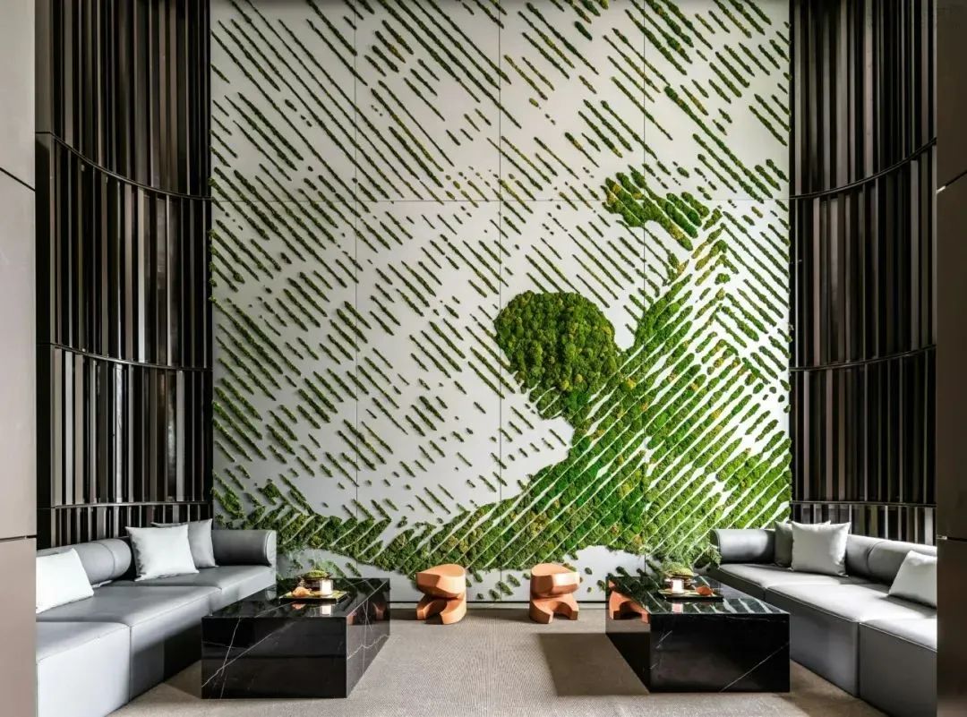 “我们在空间中融合丰盛繁茂的自然底蕴、当代先锋的人文艺术,凝练出空间独有的气质走向。”邦邦说道。自然的简练呈现出生命的本质,从自然主义的情境构建出发,取代传统的空间墙体,布鲁盟设计以大面积苔藓景观墙的铺叙,令人于游走、观赏、静处间,感知自然生长的无限生命力。