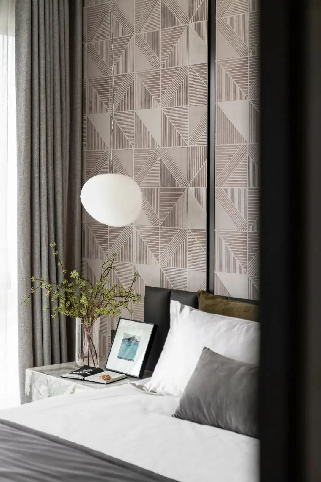 视线穿梭于主卧,观感与心绪伴着淡雅的绿意,随之沉静下来。大尺度的衣帽间与卫浴空间,衔接着居者自在的生活形态,而再停留欣赏,葱茏翠意的绿植、雅白的几何球体灯饰、简约有品的材质及造型,串联起触动人心的生活真趣,生活的姿态于此是艺术的,也是放松的、安然的。
