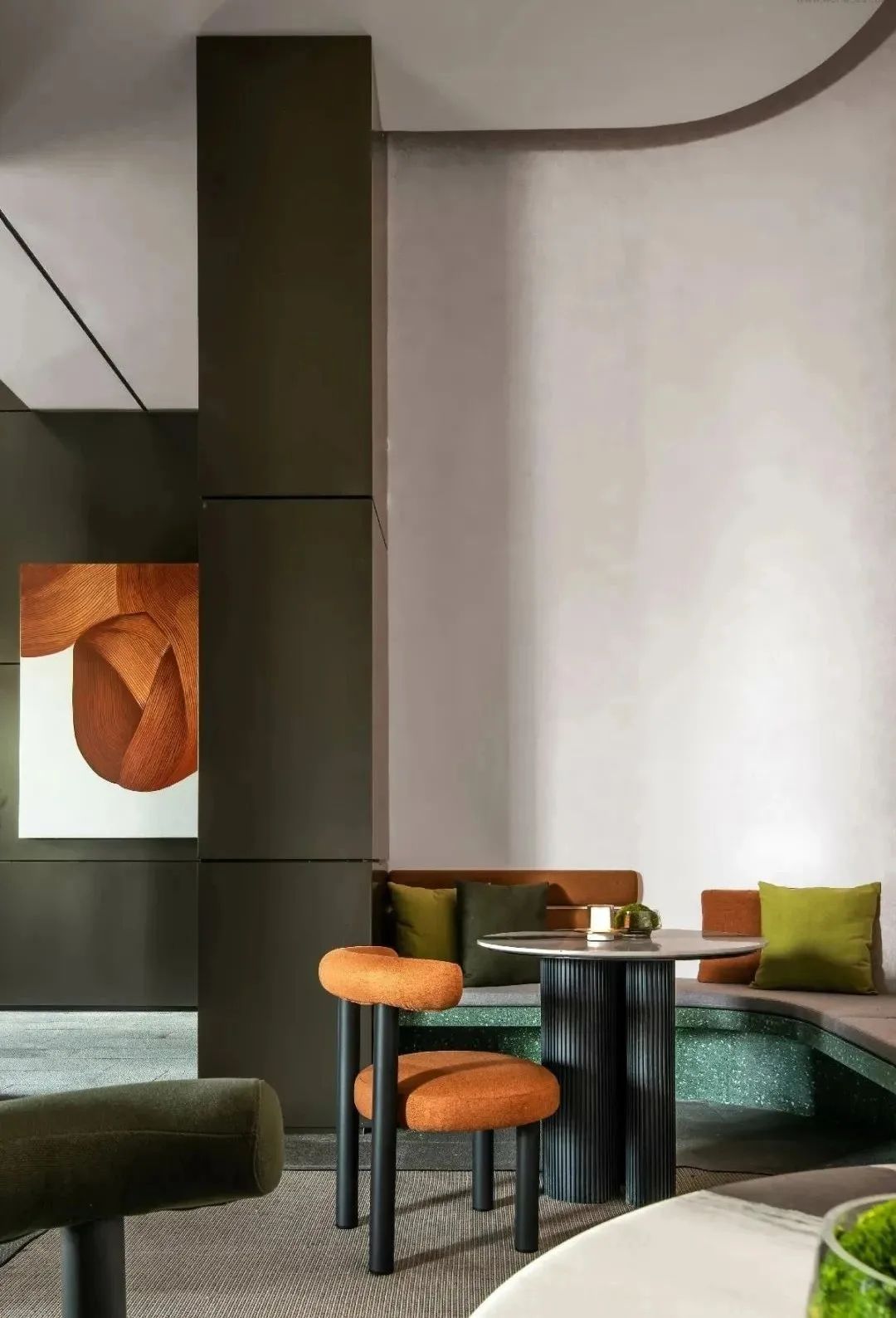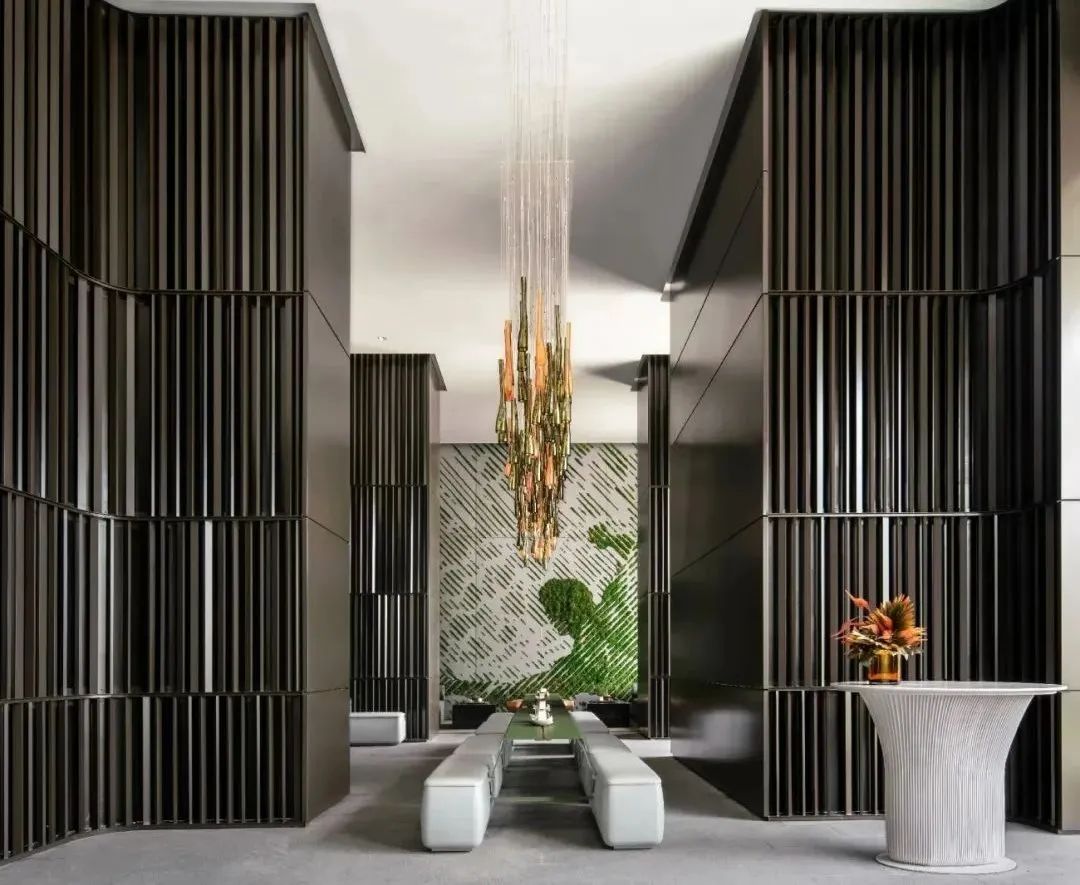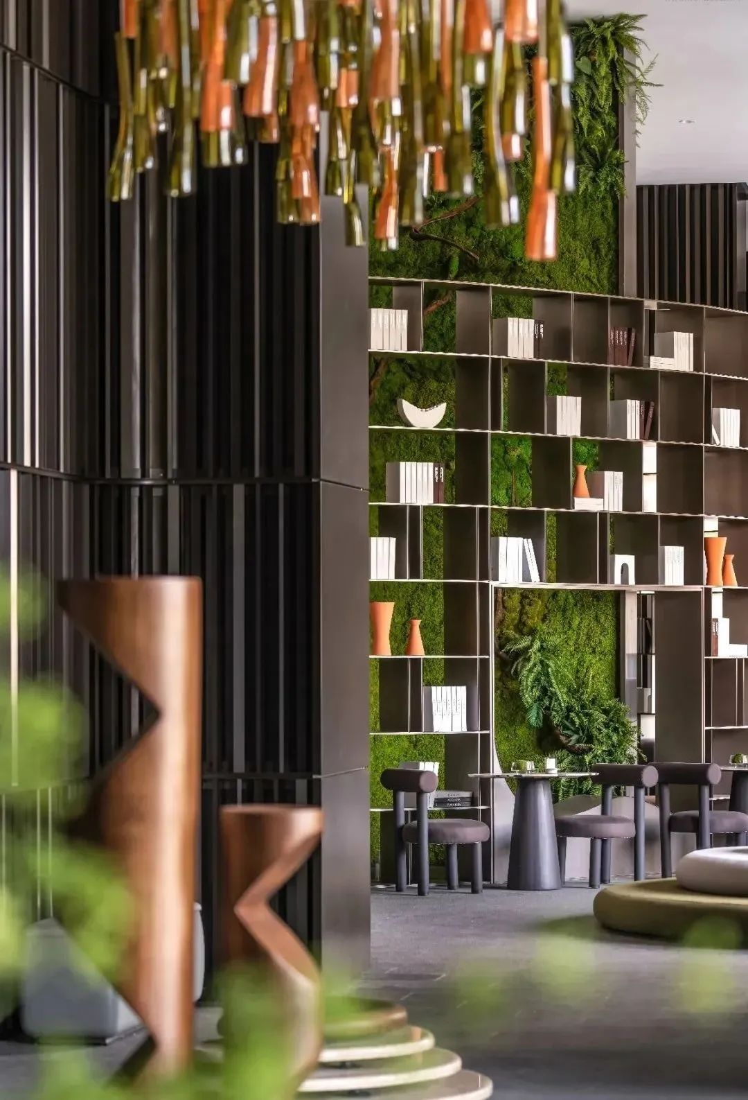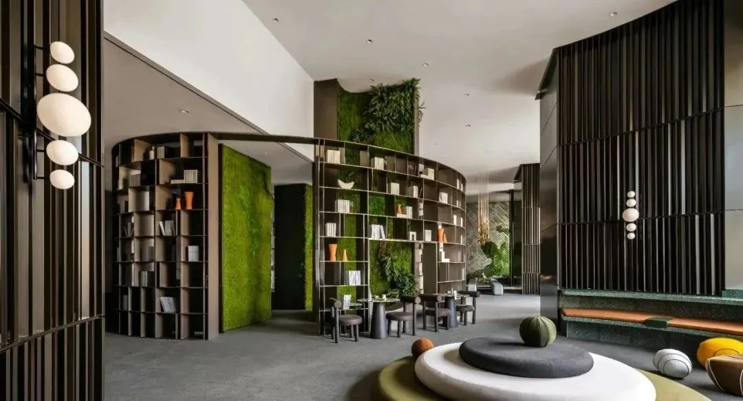 高敞开放的会客厅成为周边区域社交会客功能的补充,设计师意图在理性空间中注入艺术视觉,将自然生态与城市发展融合互生的关系一一展现,在地的公共特质与社交属性依附着绿植装饰墙体,构筑出社交沙龙与会友酣谈的多元场域,空间独特的魅力跃然成型。