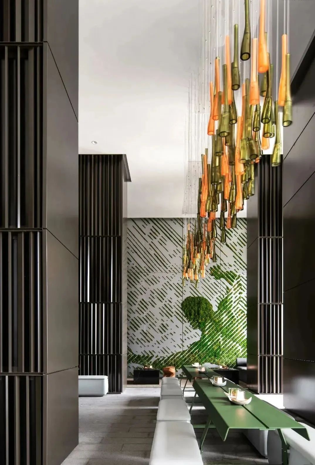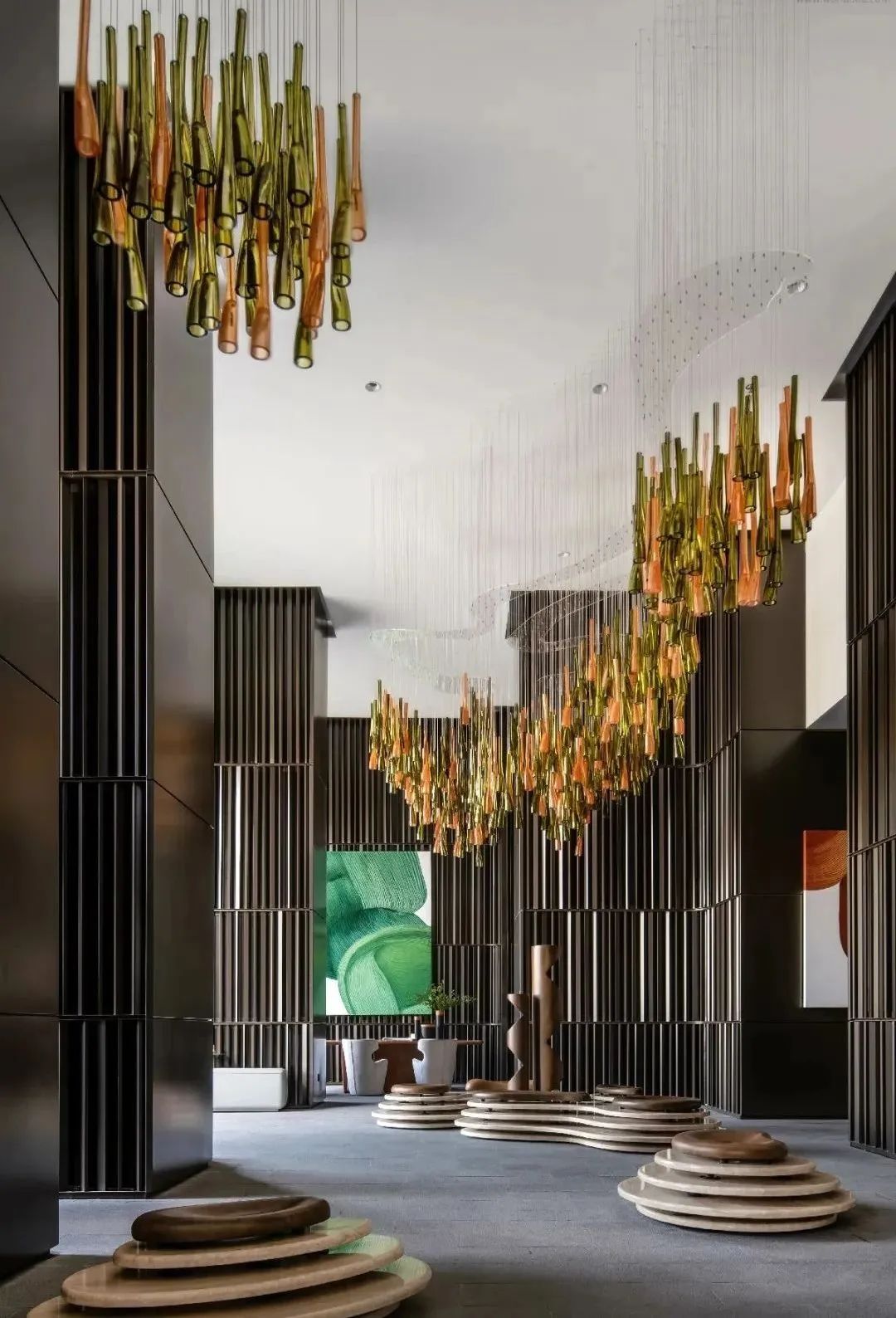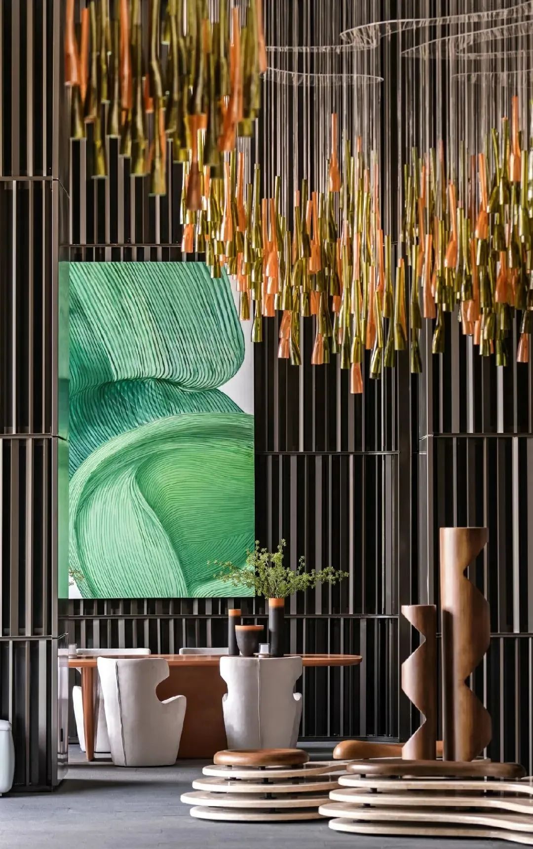 在地的自然元素被设计师引用,橙与绿的细颈吊灯以无序的阵列,模拟深圳处处可见的榕树及其倒垂的根蔓,吐露自然灵动又不失力量的韵律,环绕空间成为人文调性的焦点。
