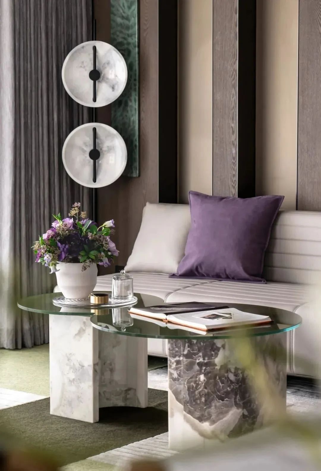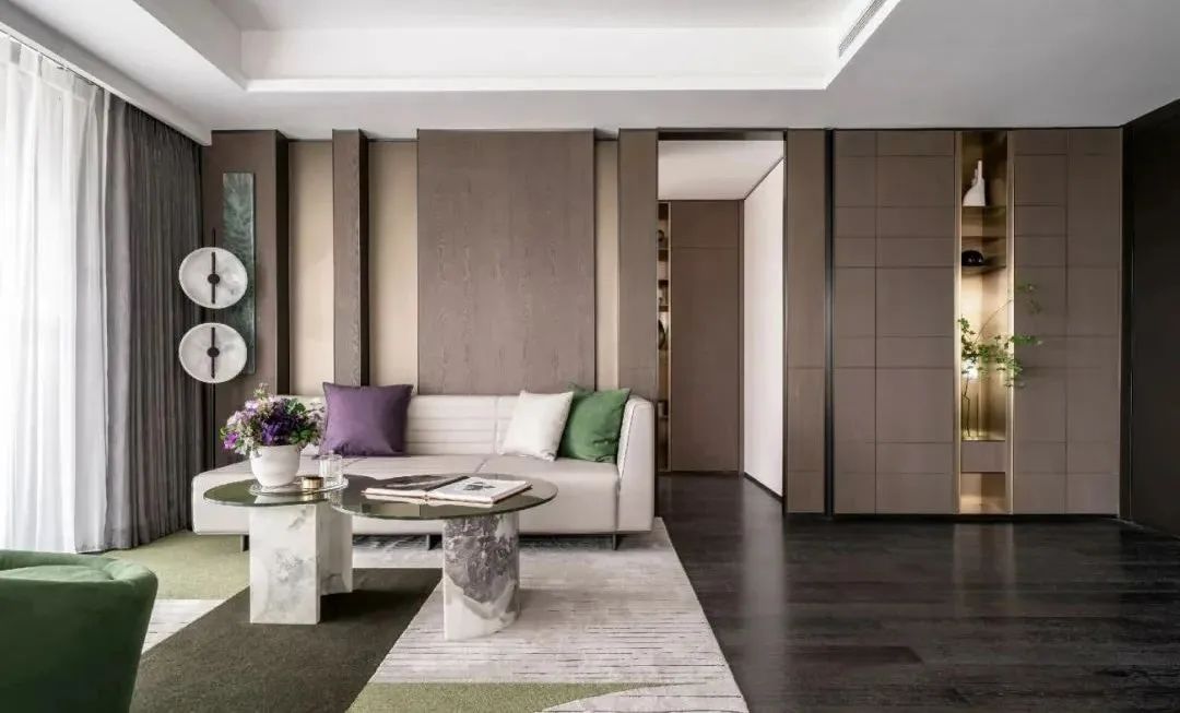 在布鲁盟设计看来,自然与艺术的融合,是一种凝练的空间力量,隐喻着诗意、自在的生活方式。打破冰冷生硬的设计语言,森林绿与木槿紫的融合,截取于自然的色彩,而同色系的现代感茶几、造型别致的皮质沙发,又于艺术质感的过渡间,折射着居者的审美、品味与个性。