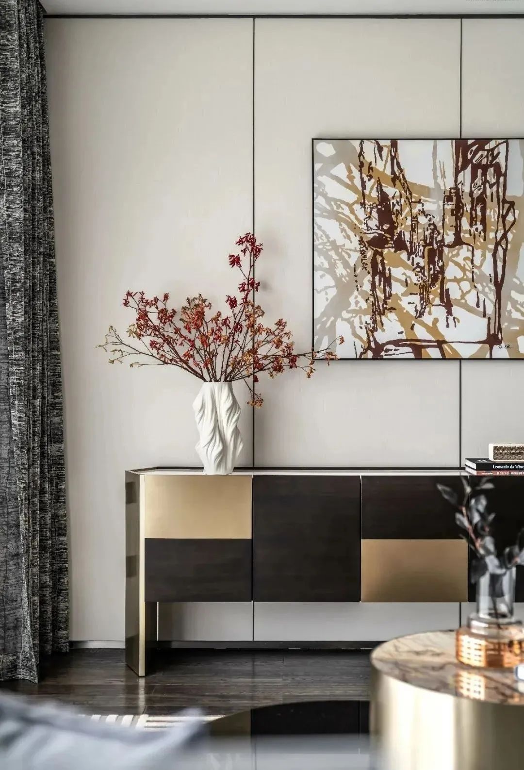 “当剥离掉表现形式后,我们希望设计所呈现的内在视像嫁接在精神之上,而置身其中的每个居者,都可以于其中悦享都市、对望自然,并真正与自我对话。”对生活情调的描摹、审美洞察的提炼、艺术风度的叙写,始终是布鲁盟设计思考的前提。在120㎡户型中,带着不凡的美学创想,设计师将一缕别致的秋意注入于空间中,让艺术与生活形成联结,让属于当代都市菁英的生活情怀自然散发。