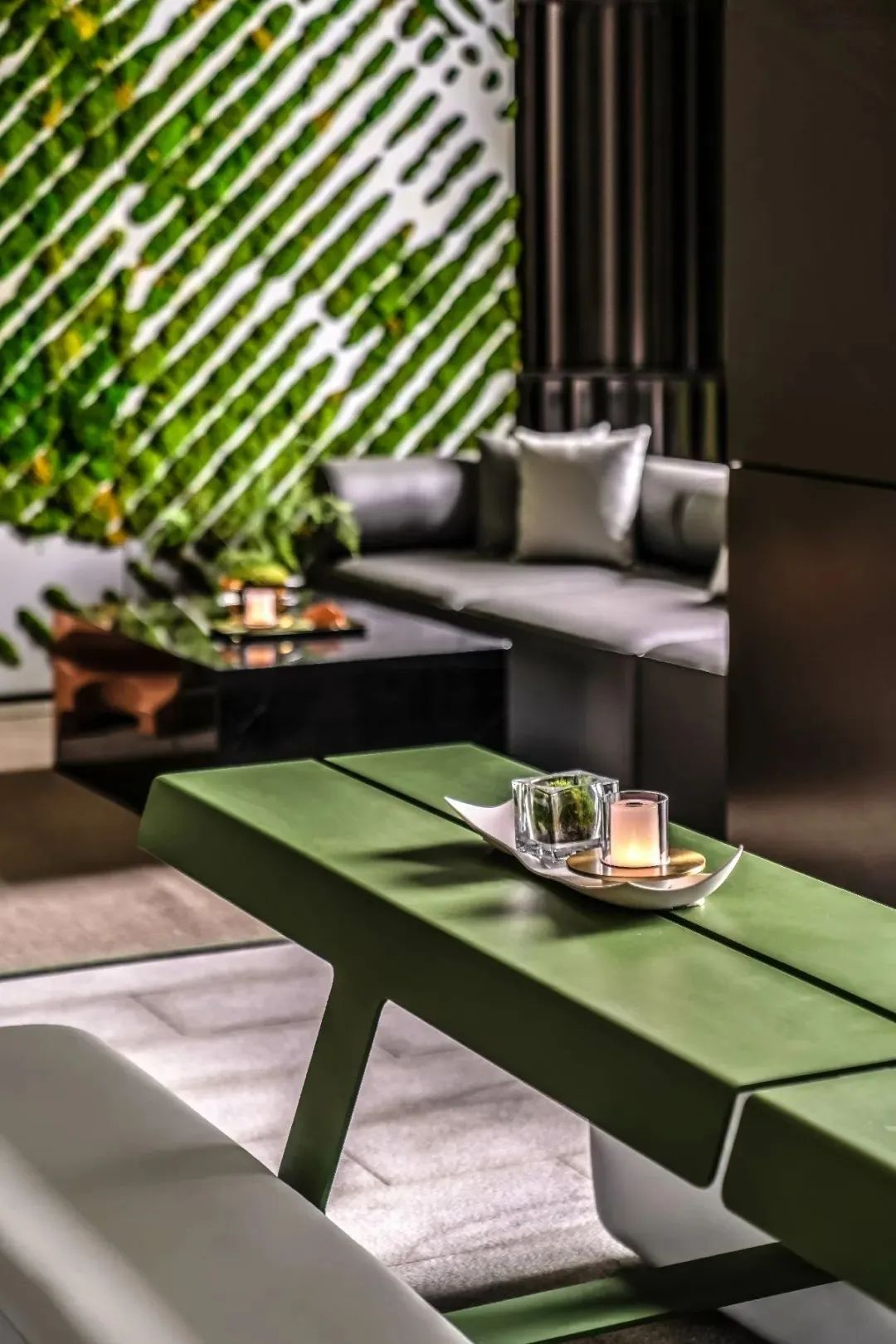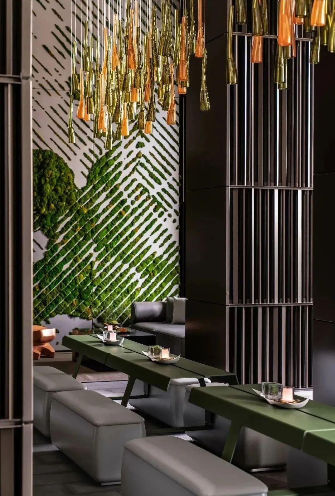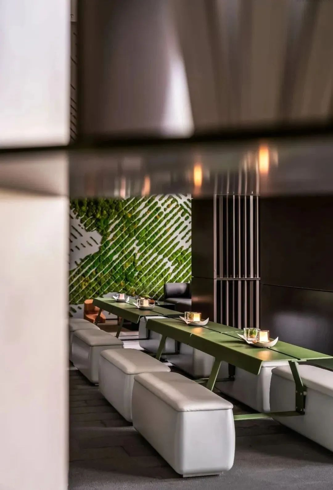 金属层叠的格栅塑造空间立面的线性关系,定制的绿色金属桌面与体块陈列的灰调长椅完美契合,在有序的划分与舒适的尺度之中,演绎着当代设计的简约美学。