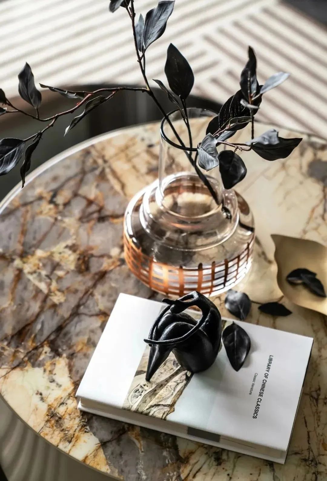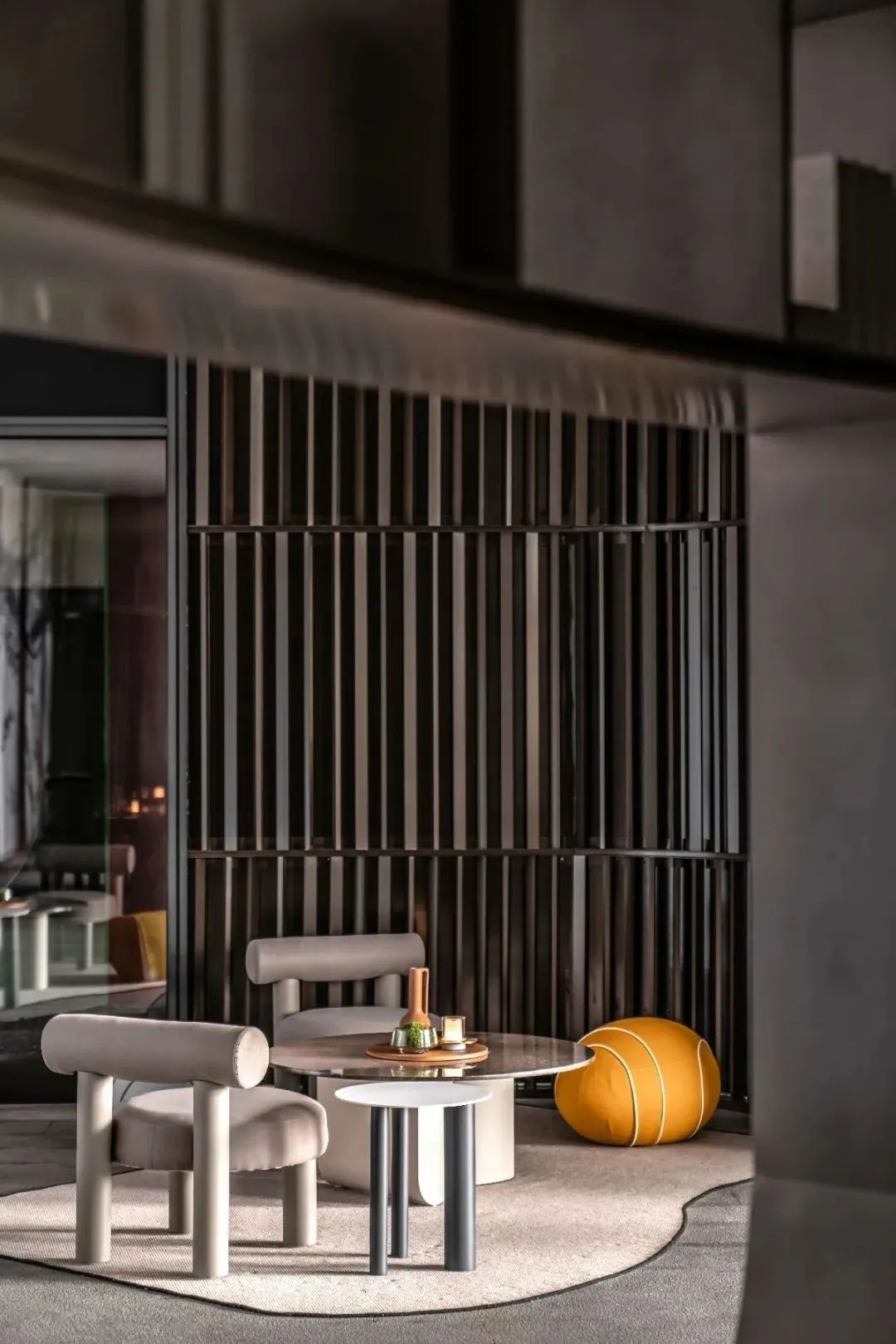 路过一隅的下午茶区,空间的打开方式沿袭“城市会客厅”的创想,抛却繁复的装饰细节,趣味灵动的家居成为点缀,在不规则羊毛地毯的质感表达中,释放共享空间的感染力,营造着简粹隽雅的空间格调,一个充满品质与艺术化的休闲场域跃然而出。