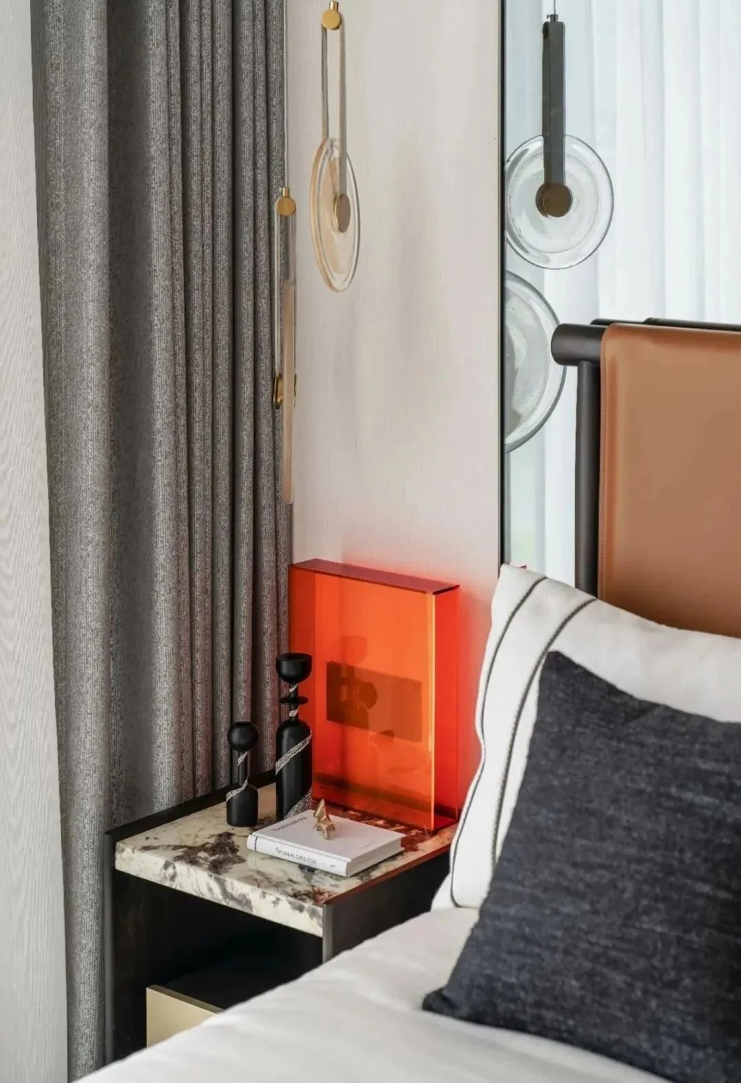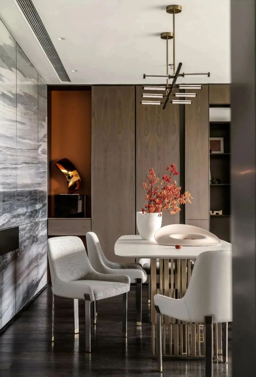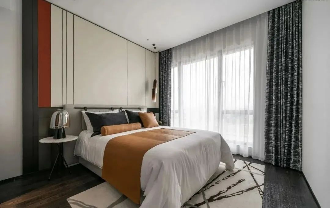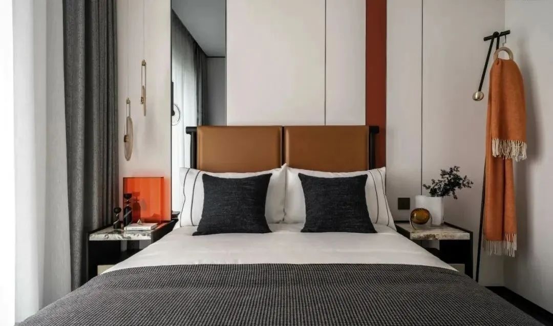 在都市人文与自然主义的融汇下,设计师将带有别致的秋意风韵融诸笔端。干枯枫叶、形如枝干的抽象挂画,点缀以烂漫的暖橙色,令空间被一派暖秋景象笼罩着,晕染出盎然宜人的生机。