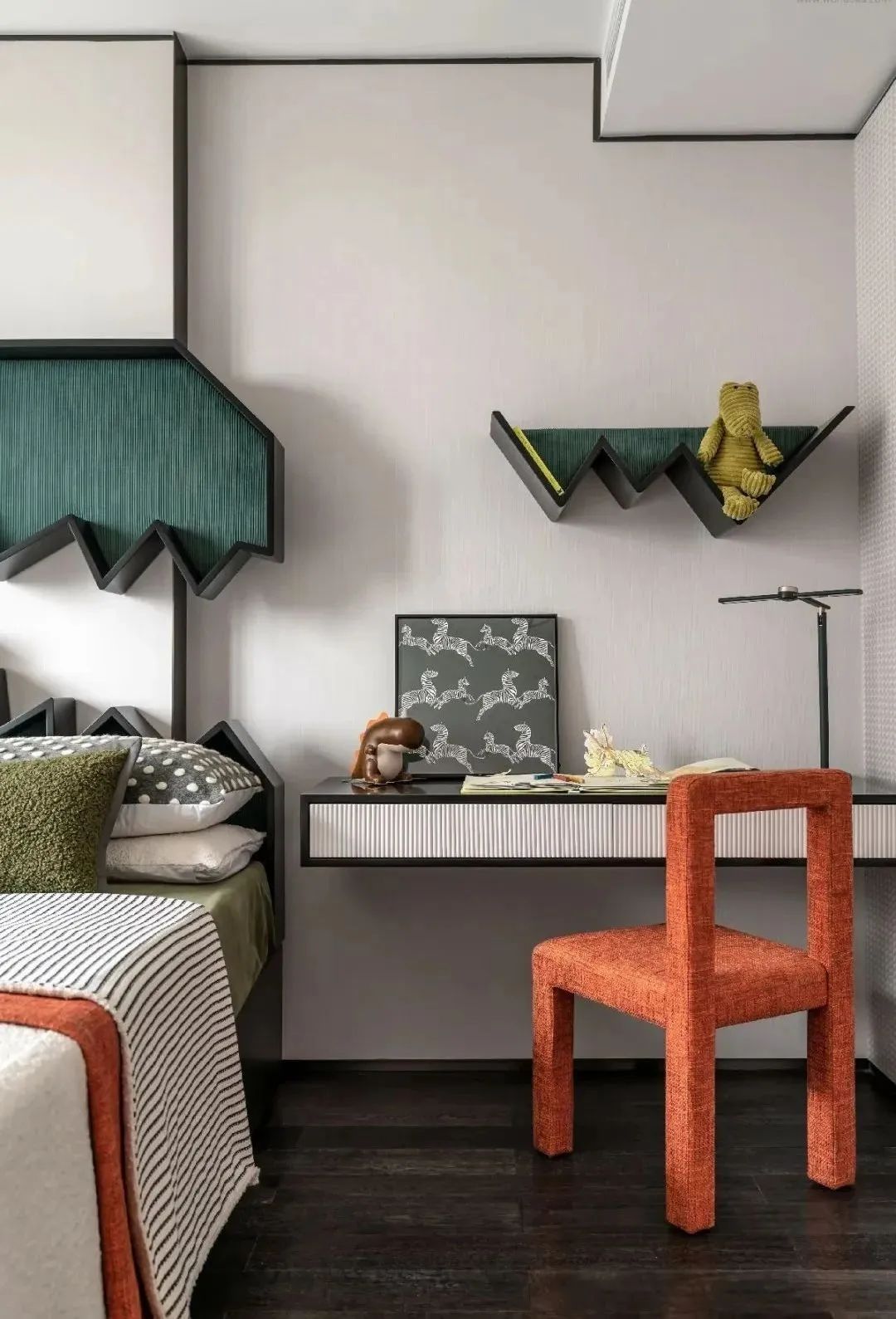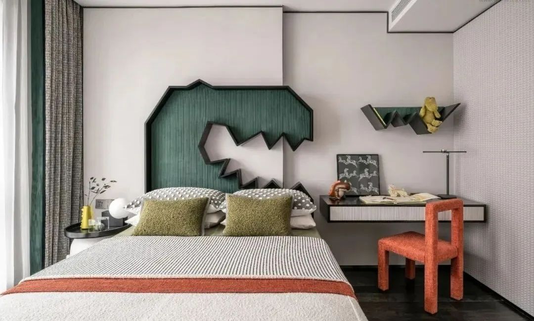 宛如一场绿野仙踪的漫游,玩趣的斑马、可爱的野兔,俏皮的恐龙,描摹着童心的底色,呼应着其对事物新鲜的探索欲。而娱乐室的一隅,黑白相间的线条与跳跃的设色组合,勾连起一片奇妙的世界,尽然释放着鲜活的创造力。
