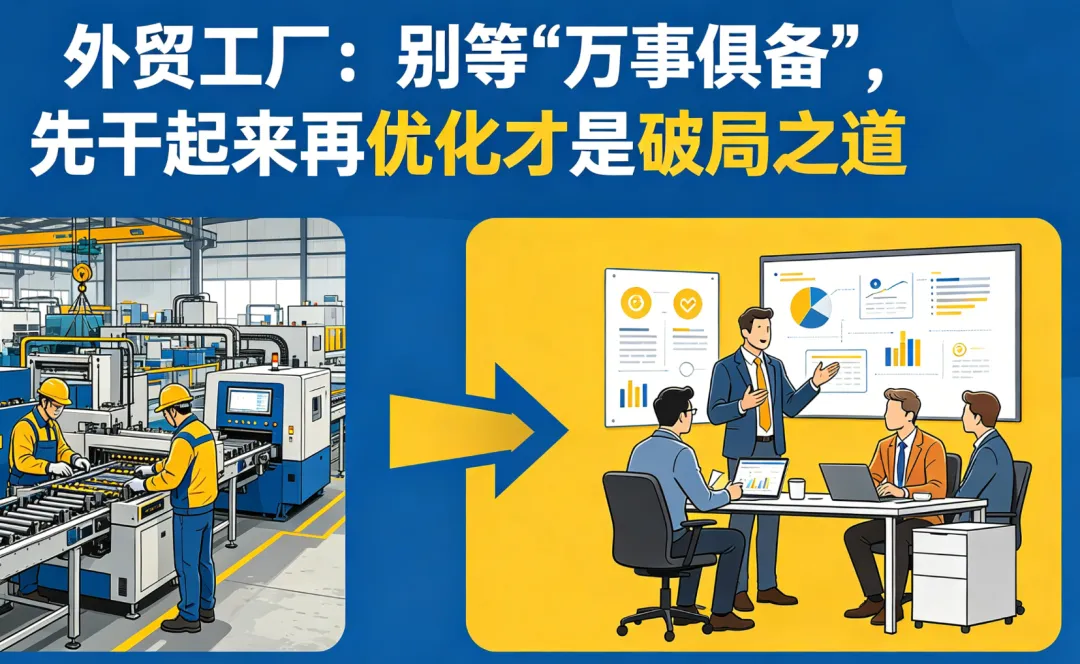 在外贸贸易蓬勃发展的今天,无数国内工厂都将外贸视为突破增长瓶颈、开拓全球市场的重要赛道。但在启动外贸业务的路口,几乎所有工厂都会陷入一个两难抉择:是等到团队、渠道、资质、产品等所有环节都“万事俱备”,再正式涉足外贸?还是先迈出第一步,在实际运营中边干边调整、边实践边优化?