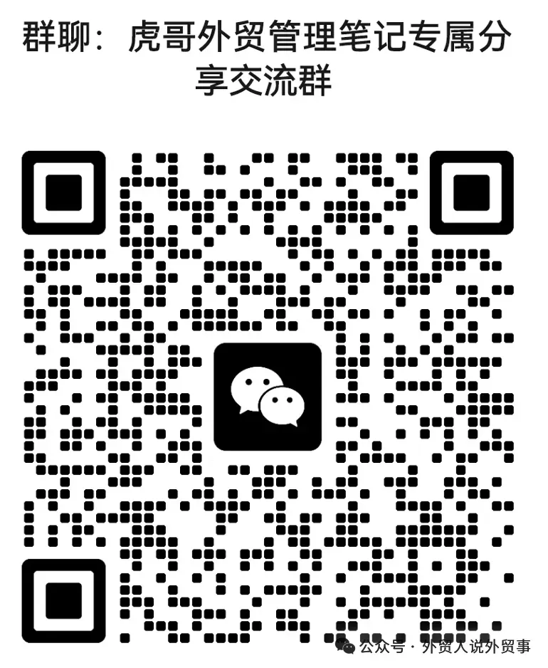 欢迎加入虎哥外贸管理笔记专属分享交流群-微信社群,每日干货文章首发、每日话题解疑答惑单独沟通、重要客户分析复盘、外贸工作摆渡、优秀岗位推荐统统一网打尽。产品路演、海外直采信息被查等一个人的智慧有限,一群人的可以走的更远。