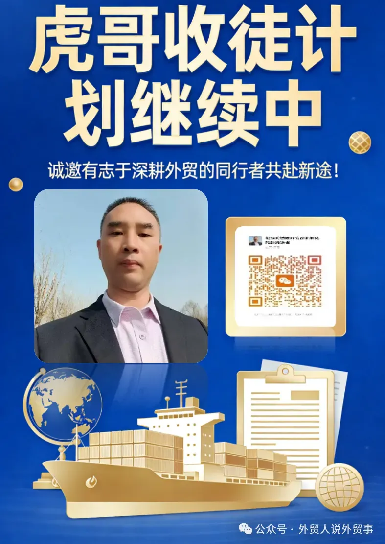 3、十年磨一剑,虎哥诚意收徒,只为寻找对外贸有强烈热爱、愿意终生深耕学习的同行者。加入虎哥弟子班,可解锁全套外贸实战实操经验,虎哥倾囊相授,助力你快速成长为外贸精英,共促外贸圈发展。诚邀有志者加入,携手共赢!希望加入的留言给我。