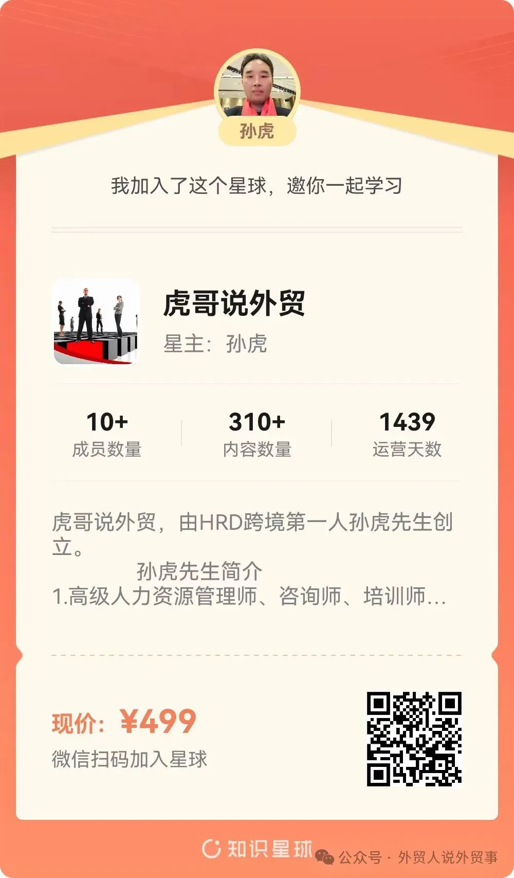 统一价格499(支持微信支付或知识星球二维码)海量学习资料,尽在虎哥说外贸知识星球。