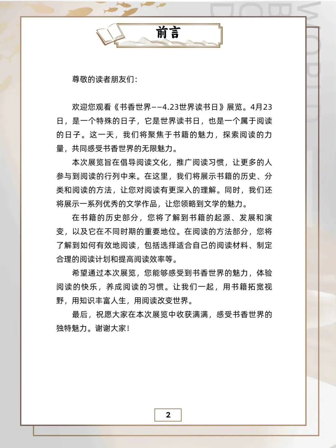 《书香世界——4.23世界读书日》展览是一个旨在推广阅读文化、庆祝世界读书日的盛会。本次展览将通过丰富的内容展示和互动活动,让观众深入了解书籍的历史和阅读方法,感受书香世界的独特魅力。这是一个以书籍和阅读为主题的展览,展示了世界各地的书籍和阅读的历史、现状、趋势和影响。展览中将展出各种书籍的图片,让观众感受书籍的文化和艺术。