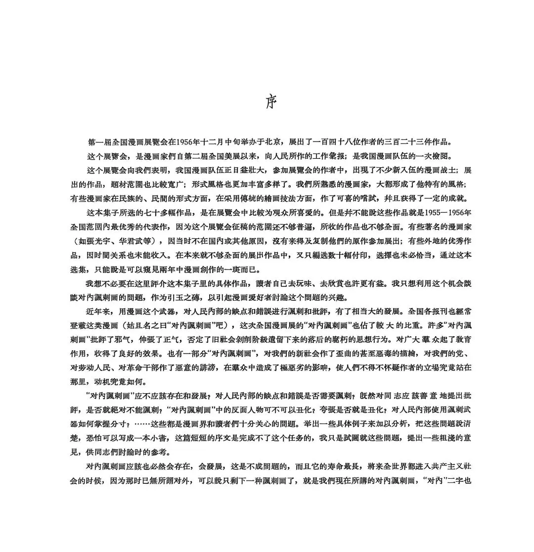 这本集子所选的七十多幅作品,是在展会中比較为观众所喜爱的。但是并不能说这些作品就是1955一1956年全国范围内最优秀的代表作,因为这个展觉会征稿的范圍还不够普遍,所收的作品也不够全面。有些著名的漫画家(如張光宇、华君武等),因当时不在国内或其他原因,沒有来得及复制他們的原作参加展出;有些外地的优秀作品,因时間关系也未能收入。在本来就不够至面的展出作品中,又只编选数十幅付印,选擇也未必恰当,通过这本选集,只能既是可以窥見兩年中漫面创作的一斑而已。