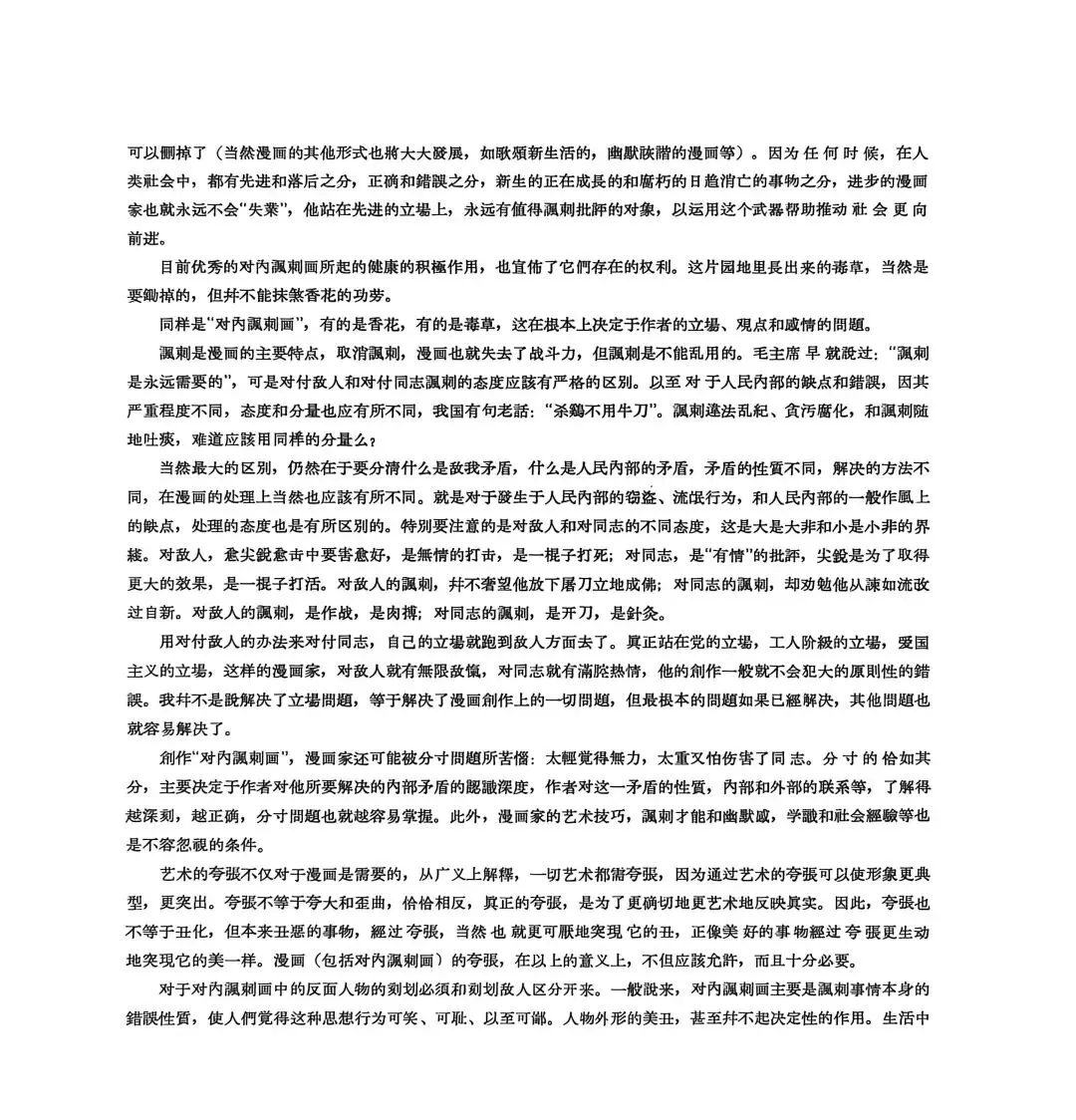 当然最大的区别,仍然在于要分清什么是敌我矛盾,什么是人民内部的矛盾,矛盾的性質不同,解决的方法不同,在漫画的处理上当然也应該有所不同。就是对于發生于人民内部的窃盗、流氓行为,和人民内部的一般作風上的缺点,处理的态度也是有所区别的。特别要注意的是对敌人和对同志的不同态度,这是大是大非和小是小非的界线。对敌人,愈尖說愈击中要害愈好,是無情的打击,是一棍子打死;对同志,是“有情”的批,尖說是为了取得更大的效果,是一棍子打活。对敌人的讽,井不奢望他放下屠刀立地成佛;对同志的諷刺,却劝勉他从如流改过自新。对敌人的讽刺,是作战,是肉搏;对同志的讽刺,是开刀,是针灸。