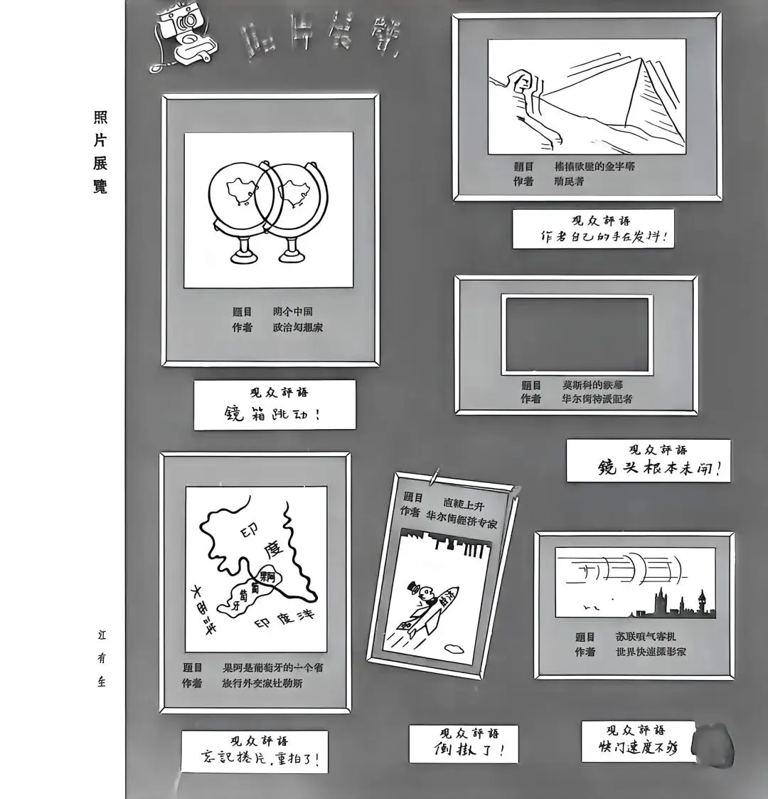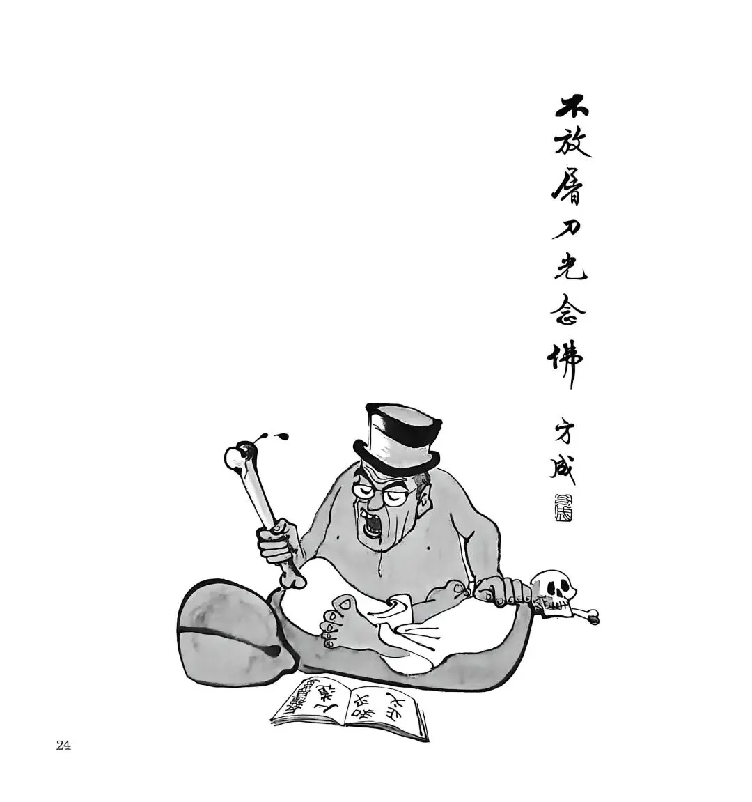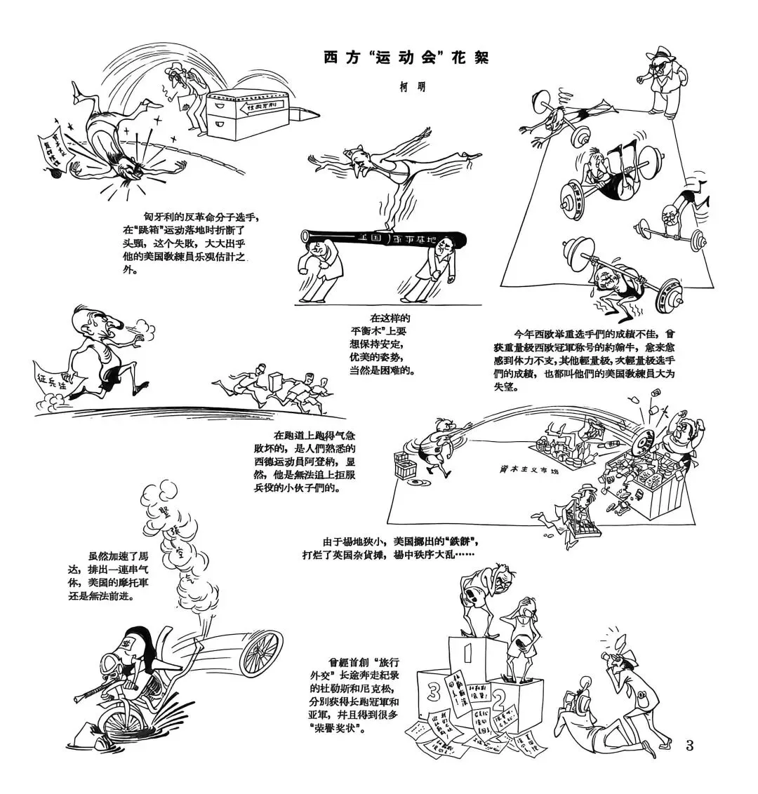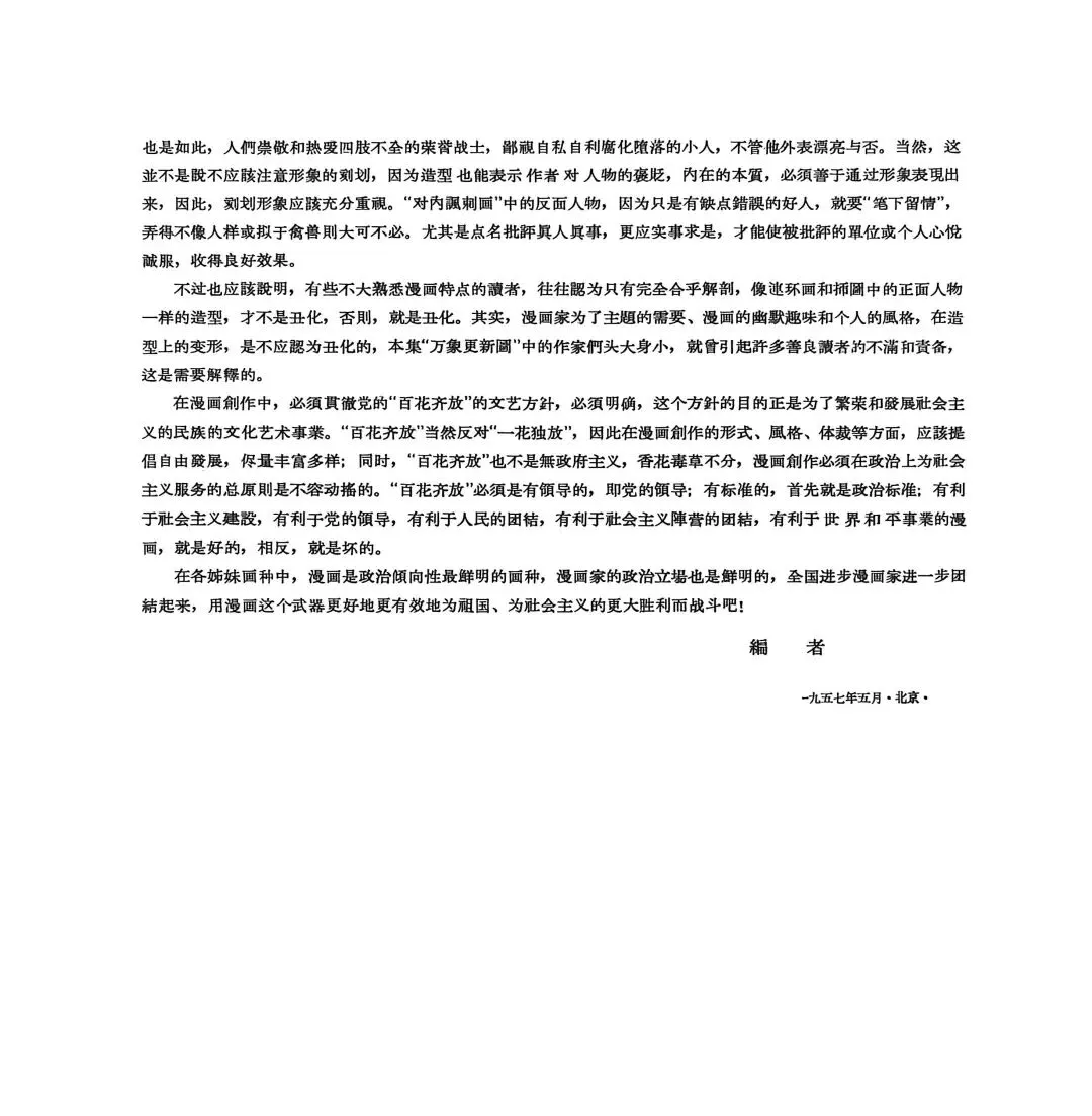 不过也应該说明,有些不大熟悉漫画特点的讀者,往往为只有完全合乎解剖,像连环画和插圆中的正面人物一样的造型,才不是丑化,否则,就是丑化。其实,漫画家为了主题的需要、漫画的幽默趣味和个人的風格,在造型上的变形,是不应認为丑化的,本集“万象更新图”中的作家們头大身小,就曾引起許多善良讀者的不滿和责备,这是需要解釋的。
