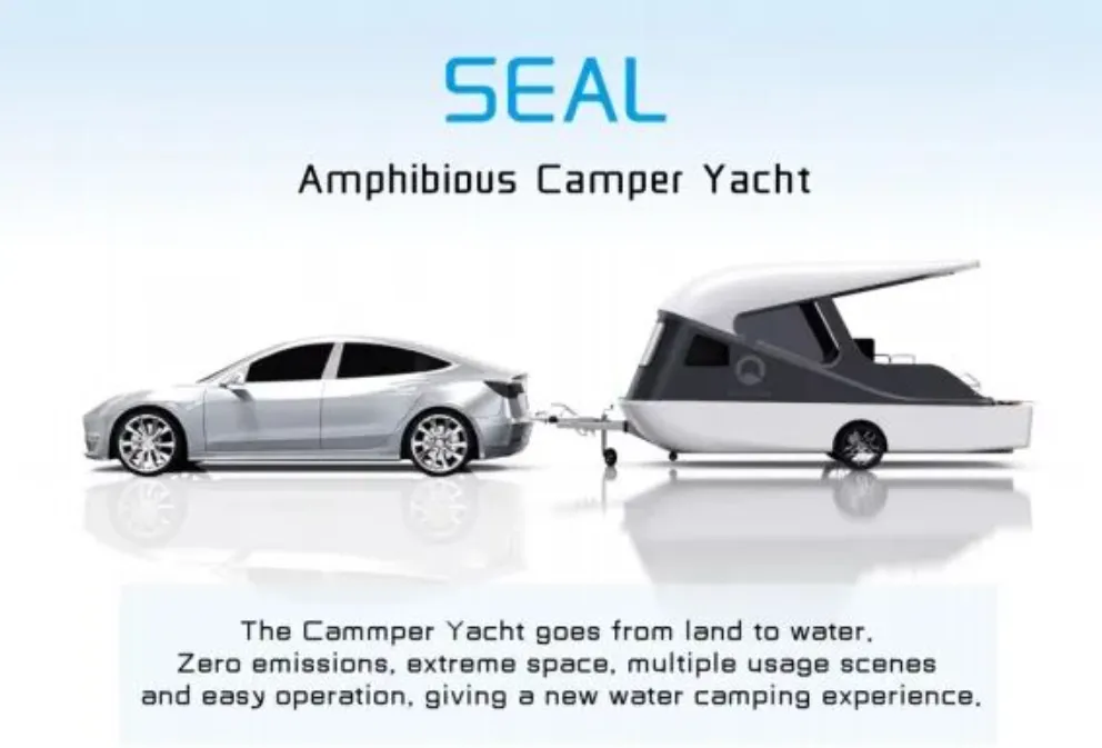 SEAL海豹两栖电动露营房艇电动游艇,获得德国红点奖,具有房车与电动艇双重特性,面向欧美的户外装备市场。是一款既能够在水面上自由航行,也能够在陆上提供舒适露营的房艇。它极具流线型的船身,酷似海豹在水里畅游时的那般灵动,也可以像海豹一样可以畅玩于水上和岸上。整车采用了黑色与白色的配色方案,给人一种清新、时尚的感觉。船体采用铝合金材质,重量更轻且更为耐用,且可100%回收。前挡风玻璃采用外摆式机构,可提高舱内通风性以及前景观赏性,两侧的玻璃窗也能很好地减小驾驶员的视野盲区。