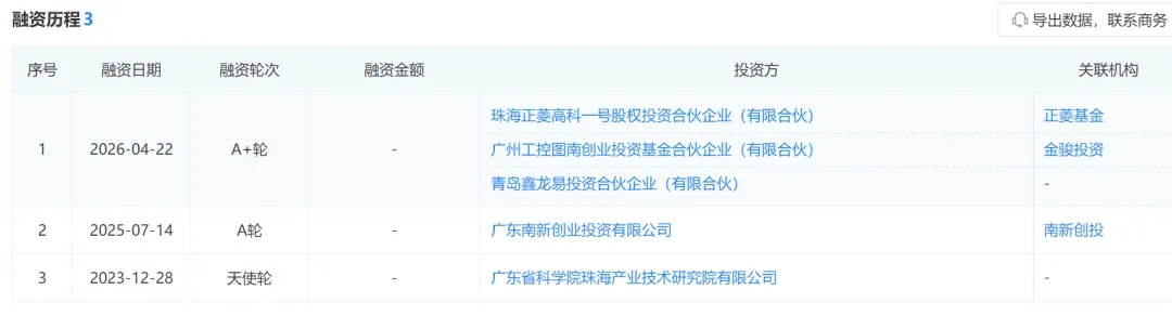 根据企查查显示,公司完成3轮融资,引入广东省科学院珠海产业技术研究院有限公司、南新创投、正菱创投、工控科创集团等外部机构股东。