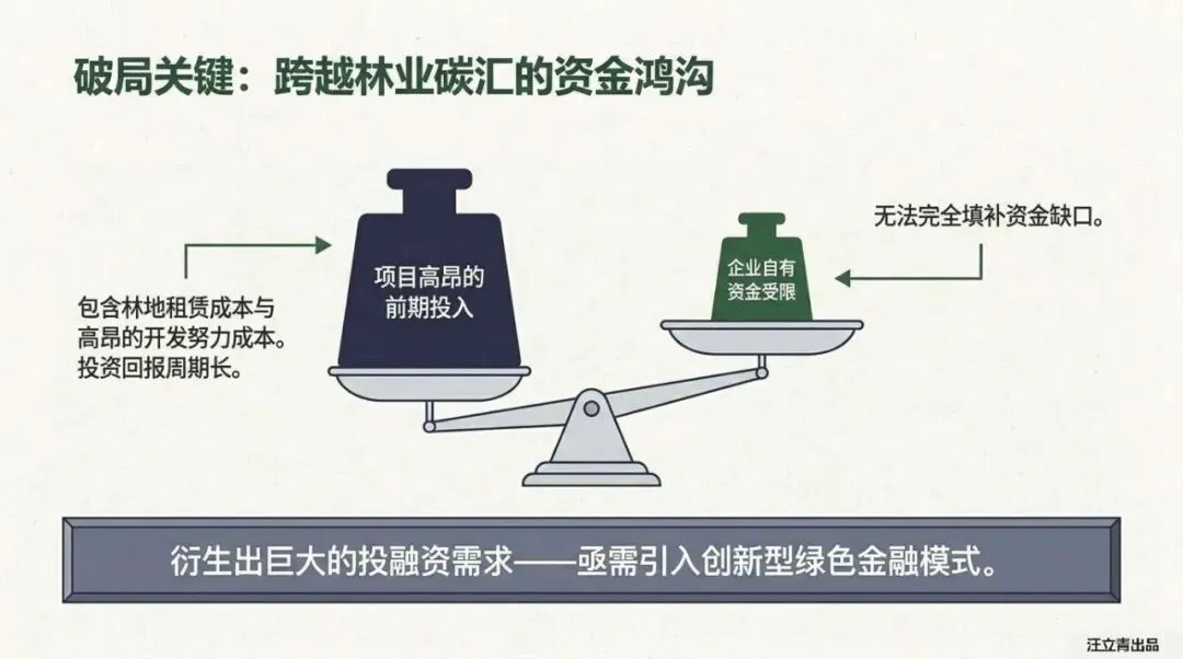 既然是好生意,为什么还没普及?因为它太贵了!开发一个碳汇项目,光是租地和前期开发的钱就像一座大山,很多企业还没见到回头钱,资金链就先断了。这就像是你想开一家“空气工厂”,但还没生产出一吨气,高昂的“入场券”和漫长的回本周期就足以让人望而却步。这种巨大的“资金鸿沟”,迫切需要更聪明的绿色金融模式来填平。