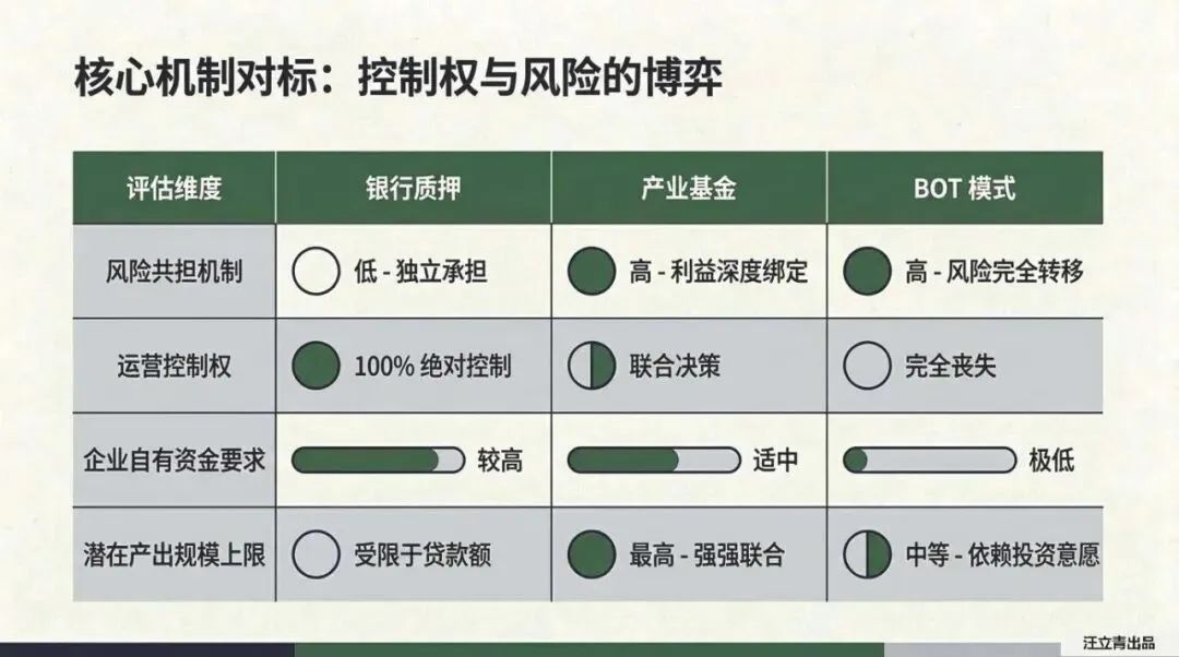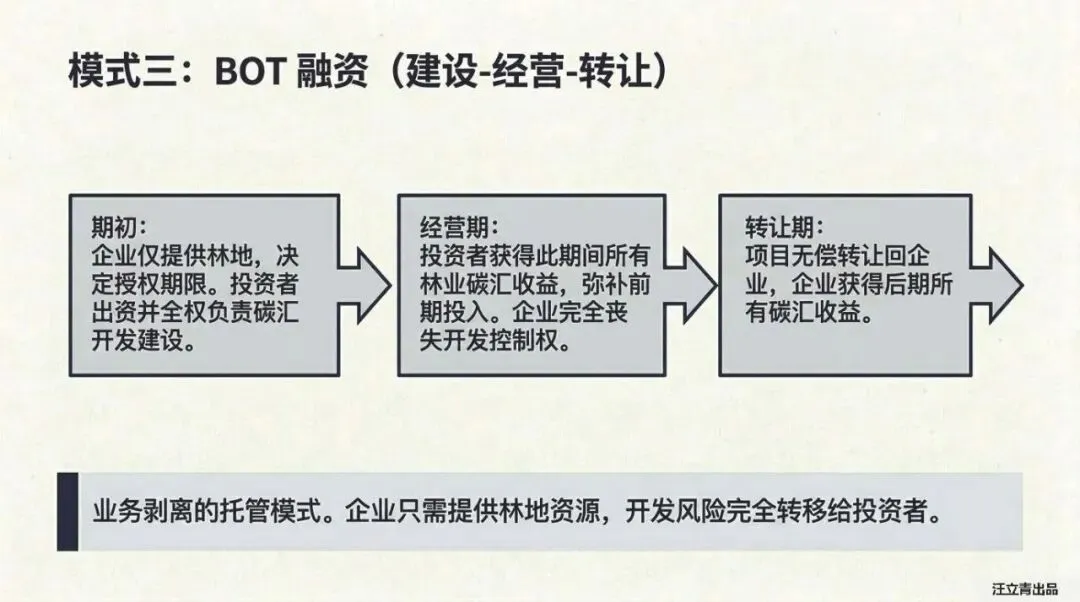 目前有三种“搞钱”模式。第一种是银行质押,就像拿房子抵押贷款,你保留100%的主权,但风险也得自己扛。第二种是产业投资基金,找个有钱有势的盟友“合伙过日子”,虽然控制权被稀释了,但能引入专业能力,产出潜力也最高。第三种是BOT模式,相当于把地租给专业团队,你出地,他们出钱出力,最后把成熟的项目还给你,这最适合手里没钱但有林地的企业。