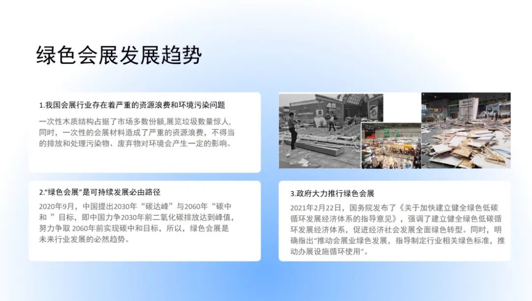 从展示设计、展台搭建及展会服务等环节实现绿色化,落实碳达峰、碳中和目标要求,自主研发会展中新材料的应用,去促进绿色布展参展常态化,推动绿色服务在展览领域中的应用面。