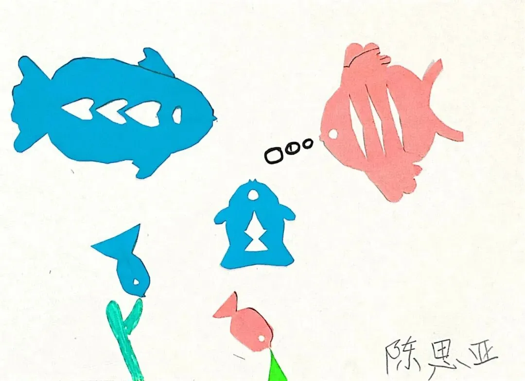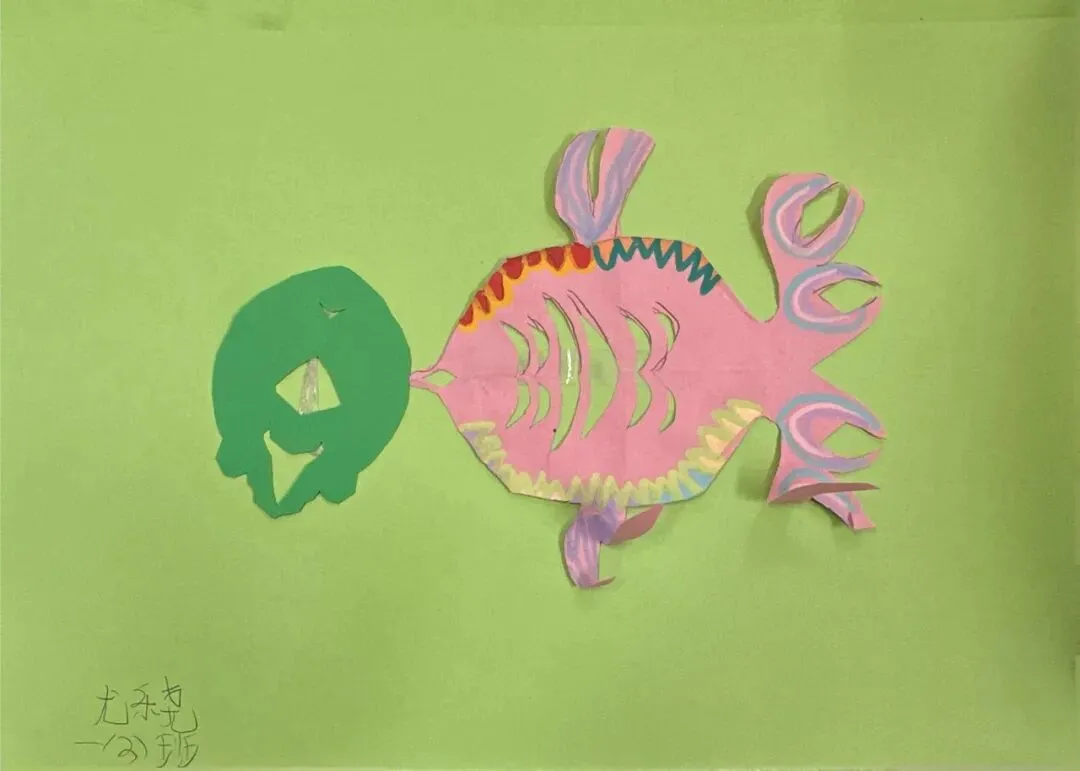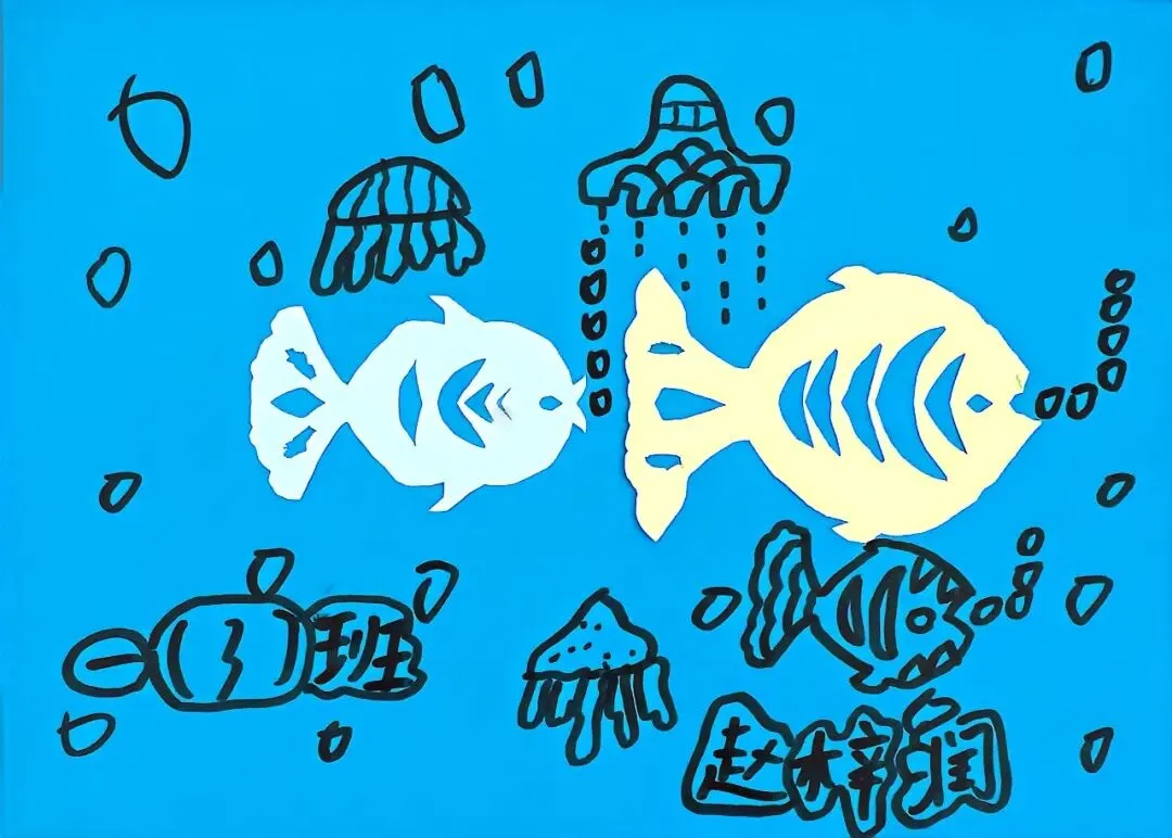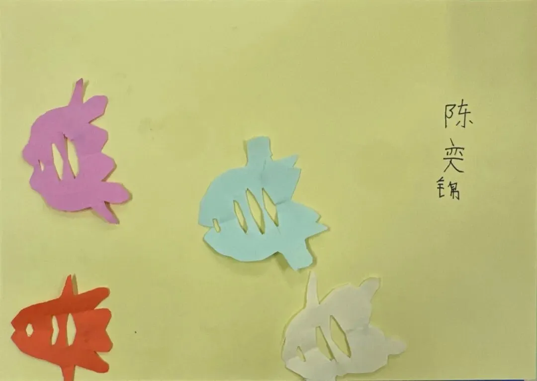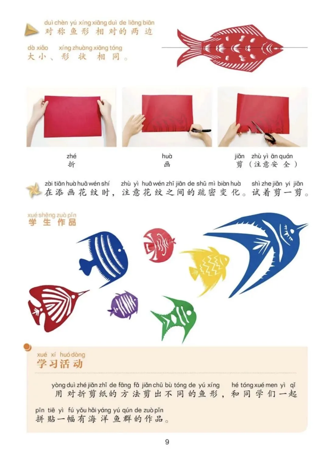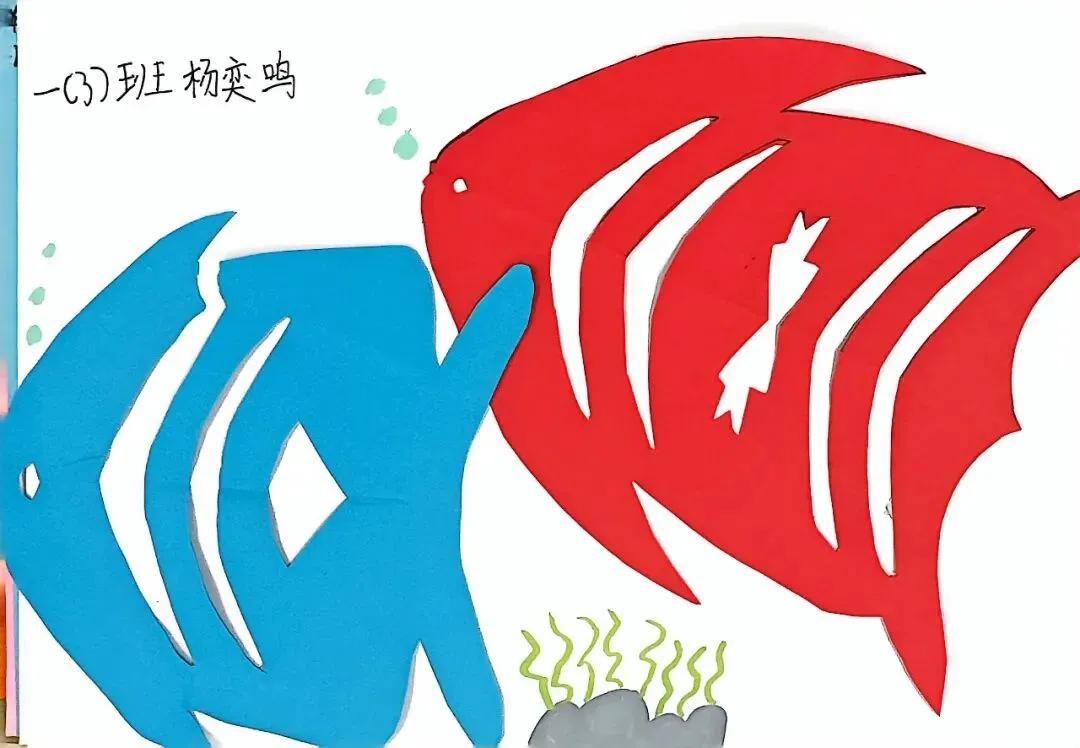 《对称的鱼形》是小学美术剪纸课,以传统双鱼扣碗剪纸为载体,引导学生认识对称美。本课通过“折、画、剪”三步教学,让学生掌握对折剪纸的方法,剪出形态各异的鱼形,感受花纹疏密变化带来的美感。教学融合非遗文化与实践创作,既培养学生的动手能力,也让学生理解对称的艺术特点,体会传统剪纸的魅力。最后通过拼贴海洋鱼群作品,激发学生的创意与合作意识,实现以美育人的目标。