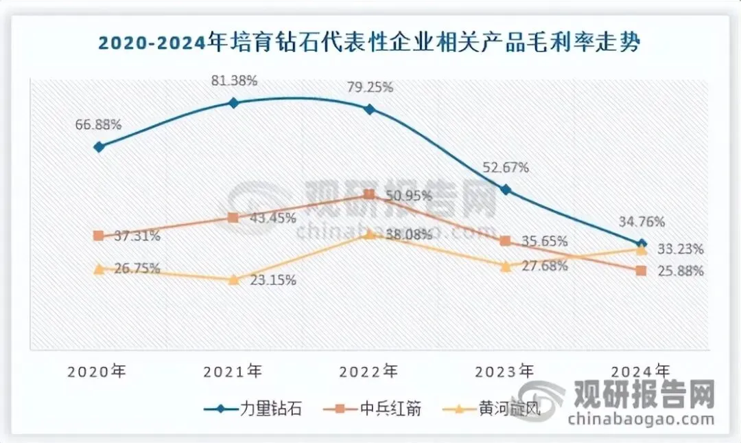 一直以来钻石行业有着较高的毛利率,这源于钻石的稀缺性,随着我国培育钻石产业的持续扩大,行业供给端的迅速扩张,使得行业竞争加剧,供大于求的格局下,行业价格有着持续下降的压力,业内企业该业务毛利率也逐年下滑,根据业内代表性公司近几年财报来看,毛利率巅峰普遍在2020-2021年,随后则逐年下滑,具体如下: