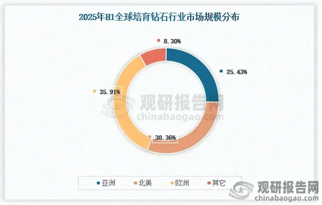 近年来,培育钻石行业在全球加速发展,截止2024年全球培育钻石市场规模达到1847亿美元,2025年上半年约为1255亿美元,保持着高速增长态势。分区域来看,欧美地区作为传统的钻石消费大区域,有着较好的钻石文化,是培育钻石重要的区域,亚洲等新兴国家则更多受益于培育钻石的低价优势而受到青睐,比例具体如下: