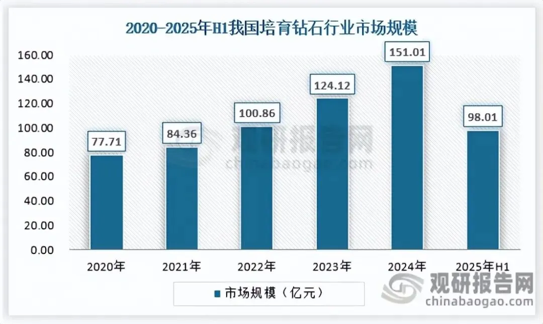 生产端培育钻石供应主要还是来自中国。终端消费则仍以海外为主,国内市场方兴未艾,占全球消费市场规模比重较低,渗透率还有较大提升空间。虽然国内市场目前还处于发展的初期阶段,但据报道,2022年以来国内市场培育钻石的接受度有明显提升,市场规模快速增长,截止2024年我国培育钻石市场规模达到151.01亿元,2025年上半年市场规模约为98.01亿元。