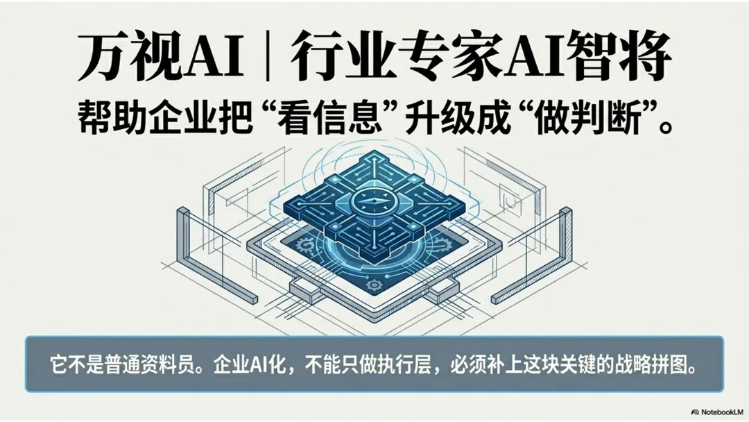 一个没有行业专家AI智将的老板,每天都在自己看、自己筛、自己判断,效率越来越低。一个拥有行业专家AI智将的老板,已经开始把外部信息,持续转成内部判断。短期看,是省时间。中期看,是少踩坑。长期看,是更早抓到真正属于自己的机会。所以我越来越相信:未来企业最值得训练的,不只是会执行的AI员工,还包括一个会帮老板看行业、做判断的AI行业专家。万视AI|行业专家AI智将帮助企业把“看信息”升级成“做判断”。