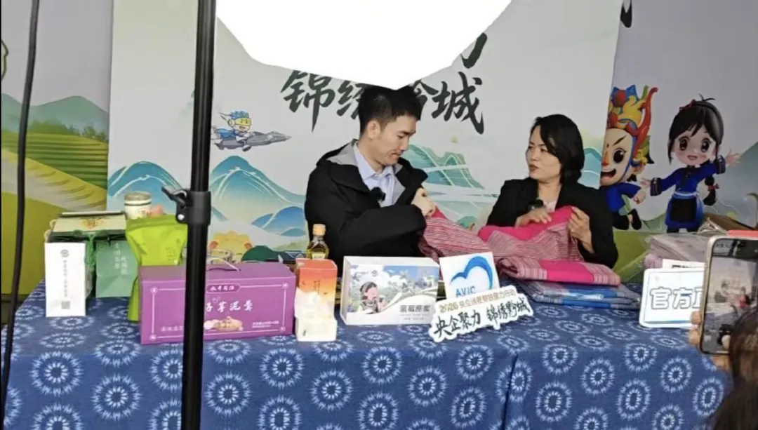 除了线下展位的精彩展示,三友土布还同步开启了线上直播带货模式。在“央企聚力 锦绣黔城”的主题直播间里,主播与品牌负责人一同向线上观众推介三友土布产品,从工艺特点到使用场景,从文化背景到消费帮扶意义,全方位展现了非遗土布的魅力。