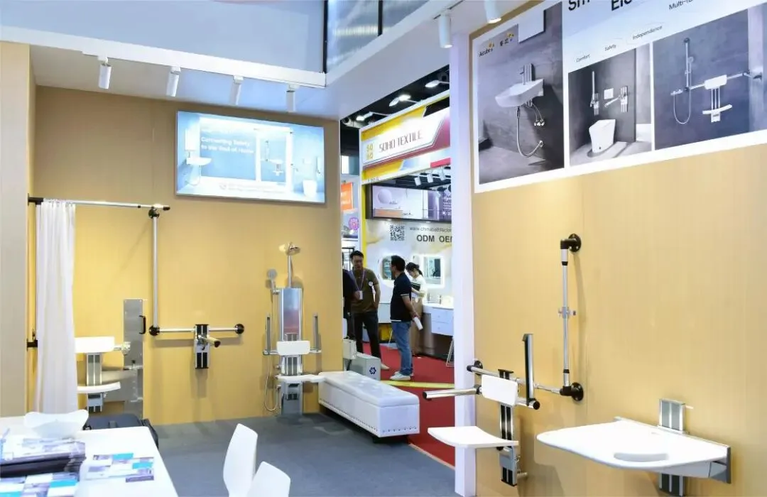作为亚洲大型淋浴门专业制造商,品本一洁具如今正大力布局银发经济,本次参展特别推出了无障碍淋浴设备,包括可调节高度的墙装折叠淋浴椅、组合式扶手系统等。“适老化产品已占到公司展品的‘半壁江山’,我们任何一个新品的设计,都会首先考虑到老人家使用的便捷性。”