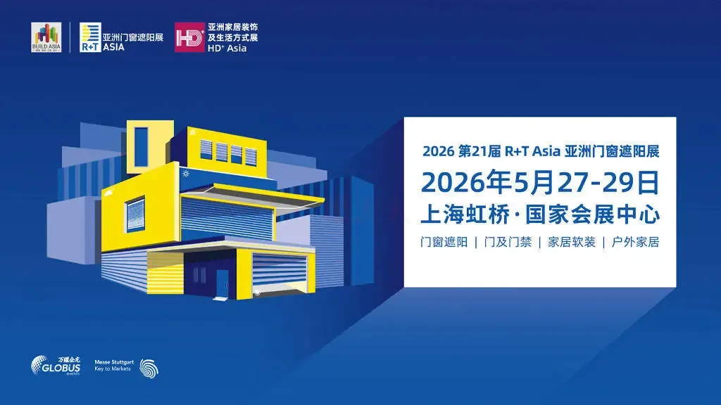 第 21 届 R+T Asia 亚洲门窗遮阳展将于2026 年 5 月 27-29 日在上海虹桥・国家会展中心盛大举办。展会将持续升级内贸服务能力,深度打通工程、设计与跨界渠道,为参展企业链接更多元的跨界资源。本届展会将携手BUILD ASIA Mega Show 亚洲建筑及装饰联展、DOMOTEX asia/CHINAFLOOR 中国国际地面材料及铺装技术展览会、HD+ Asia 亚洲家居装饰及生活方式展,以 **“建装一体化”** 为核心主题,全面整合建筑、装饰、软装与智装全产业链资源,聚焦工程、设计、应用及跨界四大板块。助力门窗遮阳品牌高效拓展海内外经销代理渠道,精准对接工程集采、设计机构及终端应用市场,挖掘多元化业务新增长点。