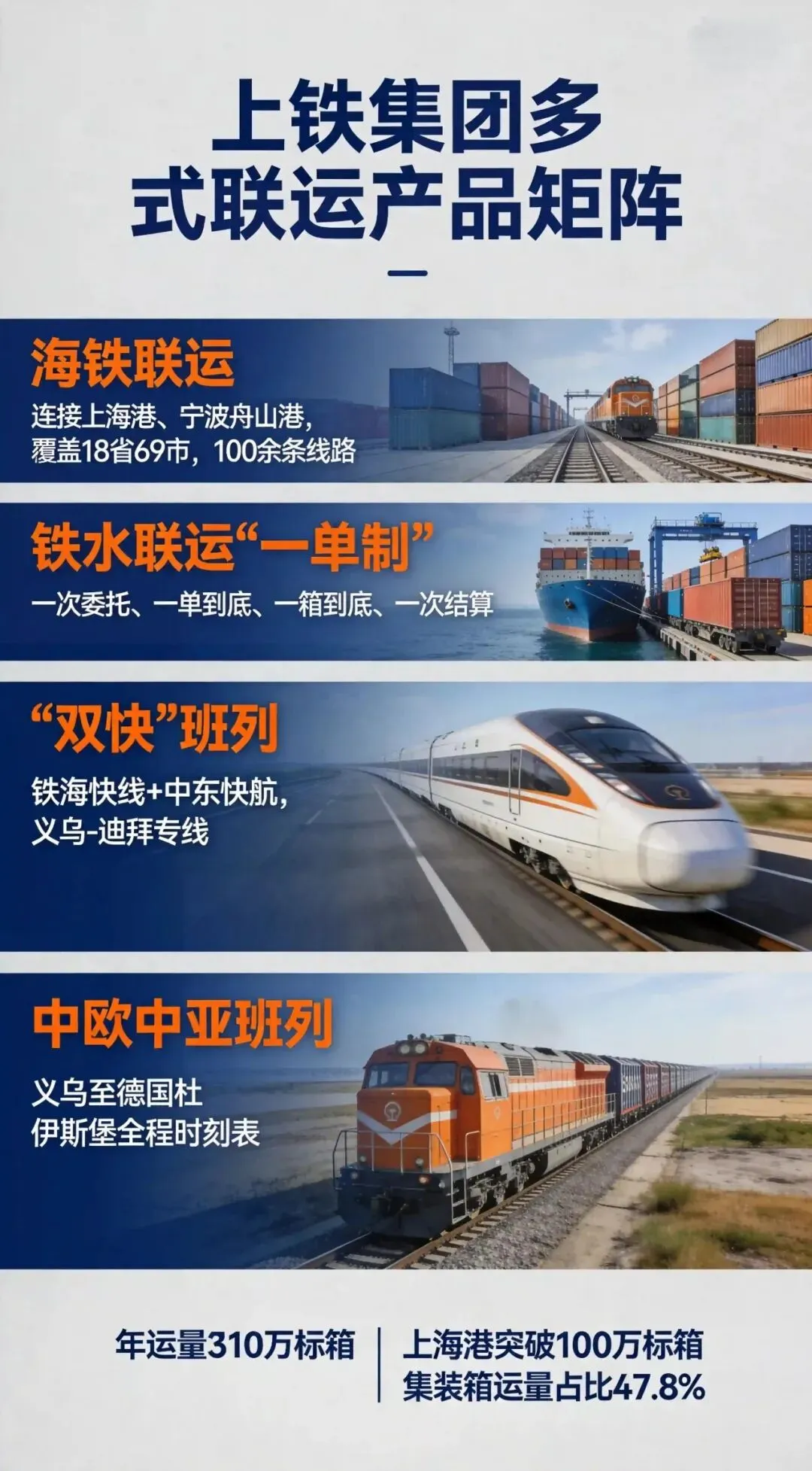 上铁集团多式联运的实战成绩单,确实亮眼:上海海铁联运业务量2025年突破100万标箱,同比增长约20%。全年预计完成310万标箱,比去年多出21.3万箱。服务范围覆盖全国18省69市,已开行海铁联运线路100余条。"十四五"以来,货物发送量达到9.9亿吨,比"十三五"增长8%。集装箱运量占比提升到47.8%。中欧班列累计开行20008列,年均增长7%。06 对从业者的启示