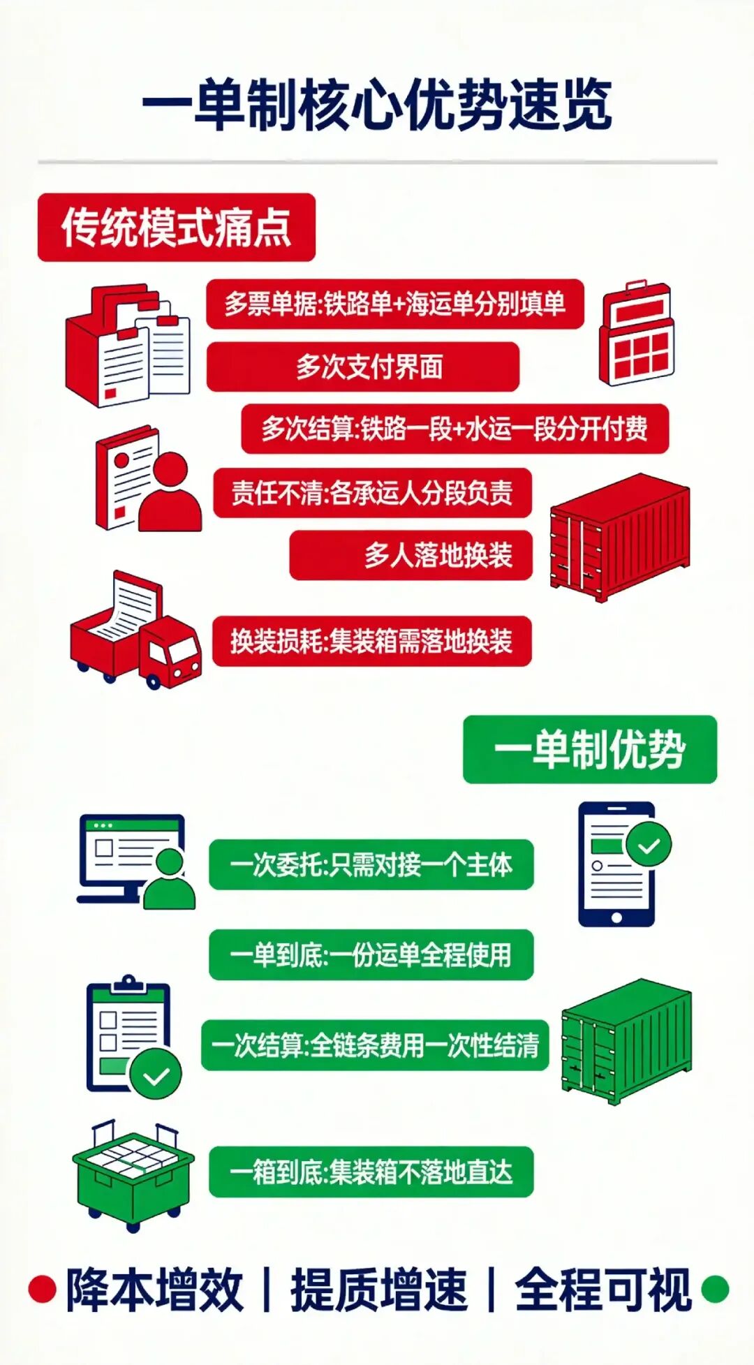 2025年4月9日,长三角首列铁水联运"一单制"货物列车从安徽蚌埠货运站驶出。这趟列车搭载着5个40英尺集装箱的麸皮等谷物加工副产品。运输路线是这样的:先走铁路到南京龙潭港,再经水运驳运至上海港,最后通过物流快航班轮运抵东莞石龙港。换作以前,这批货要分别办理铁路托运、港口装卸、水运订舱,至少对接三四个主体。现在呢?客户只找上铁集团一家,剩下的全不用操心。 "一次委托、一单到底、一箱到底、一次结算"——这四个"一",就是"一单制"的核心。04 背后的运营创新