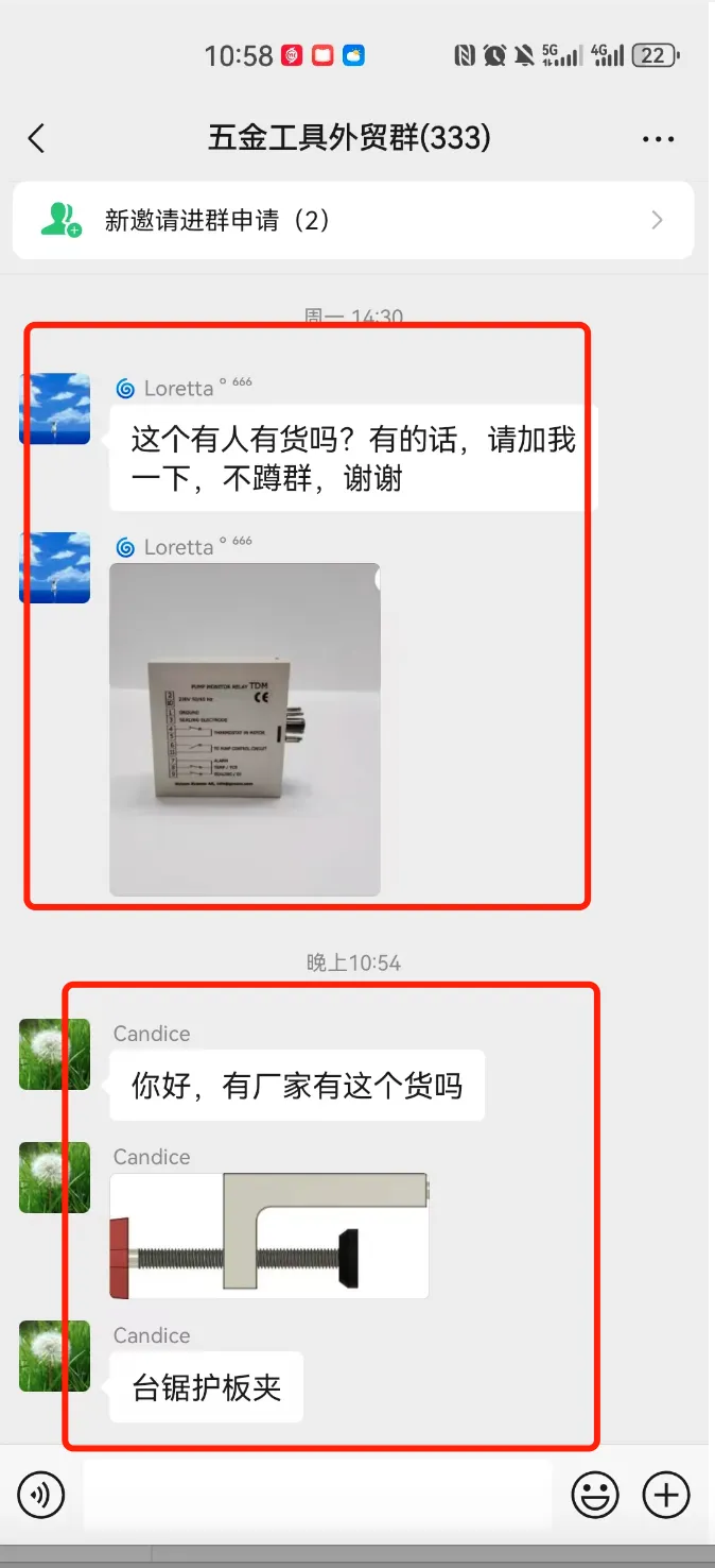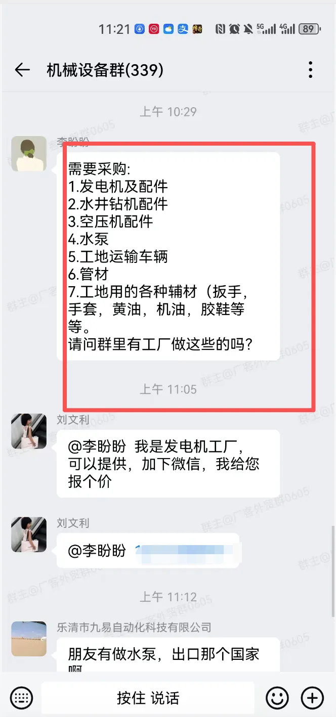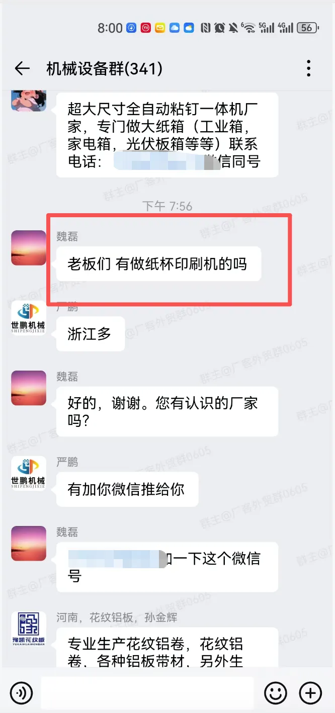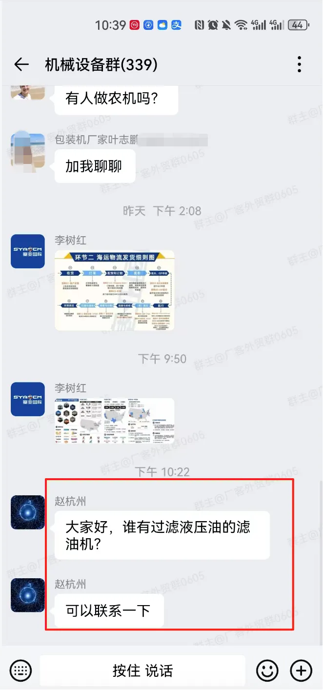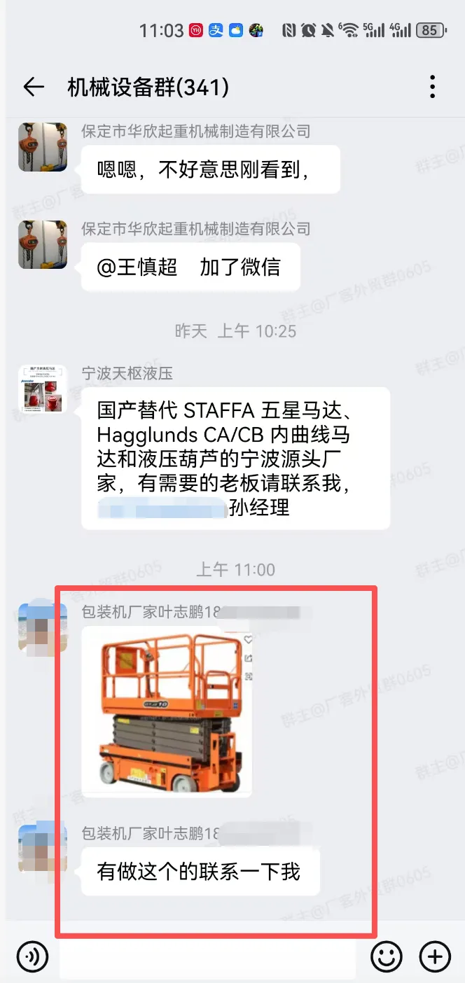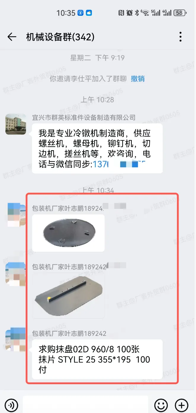 机械设备交流群,一个现有340多人,另一个有210多人,有采销需要的外贸人可以加入!群里可以发布的信息:外贸采购信息、产品销售信息,文字、图片、视频都可以,控制广告频率,不能刷屏广告。