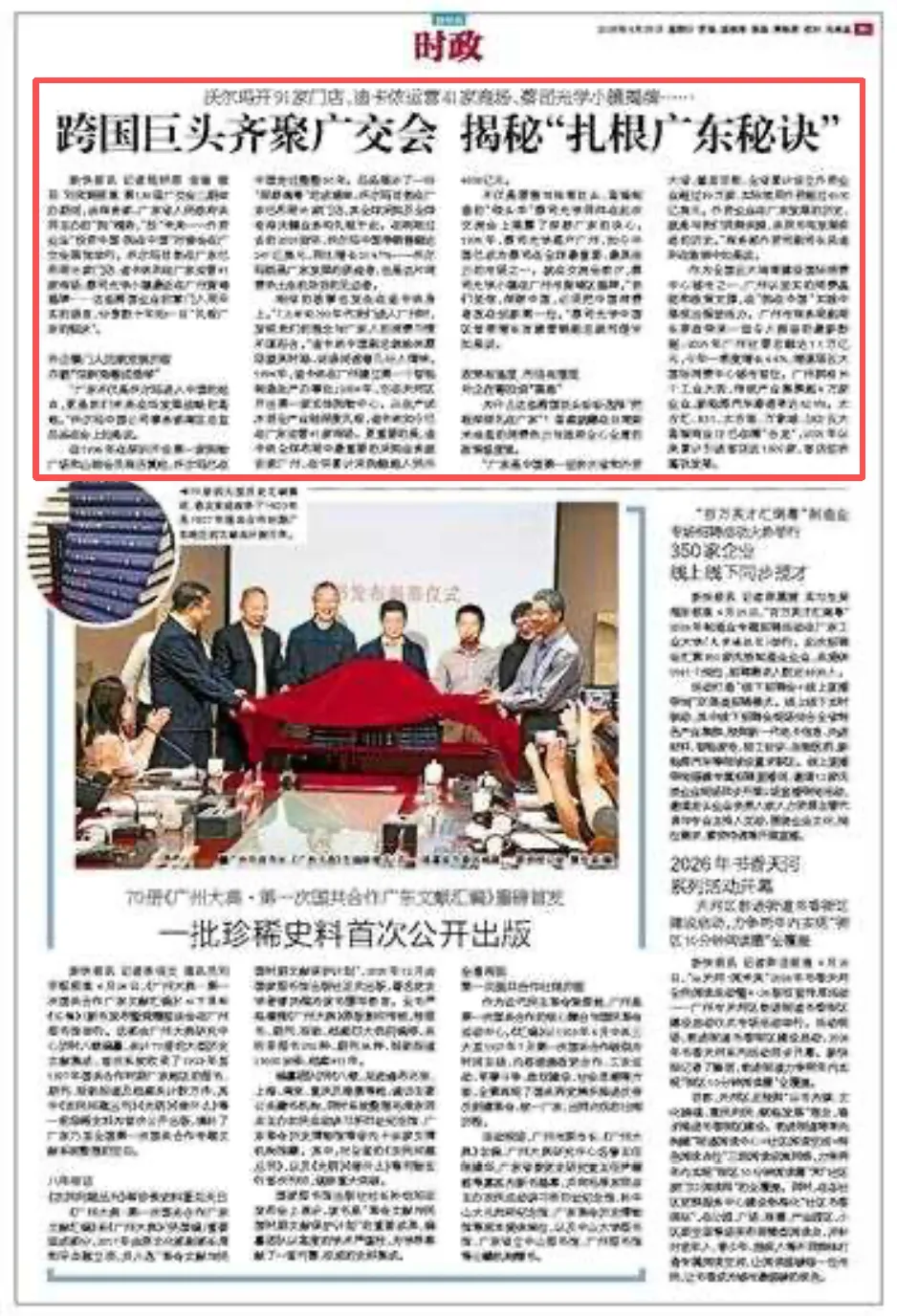 4月26日,新快报刊发《跨国巨头齐聚广交会 揭秘“扎根广东秘诀”》,内容如下: