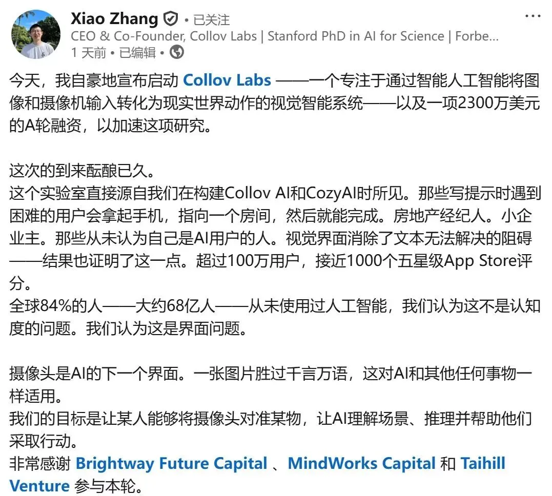 创始人兼CEO张霄认为,文字prompt对大多数普通用户来说仍然存在较高的使用门槛,而人类最自然的信息获取方式是视觉。Collov要做的,是让用户拿起手机对准一个场景,AI就能"看懂"画面、理解意图、给出可执行的方案。