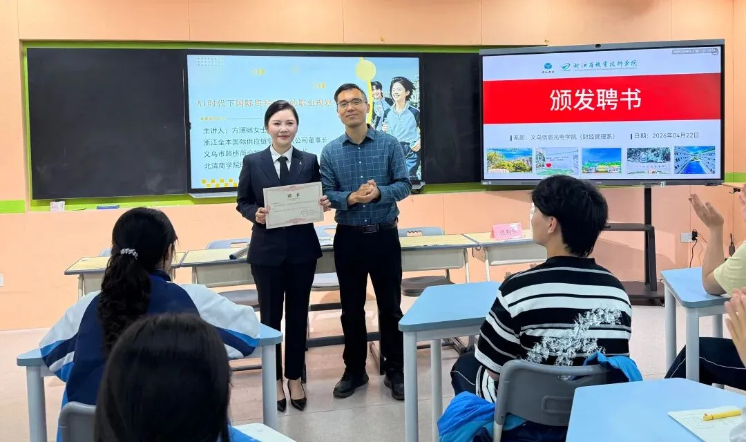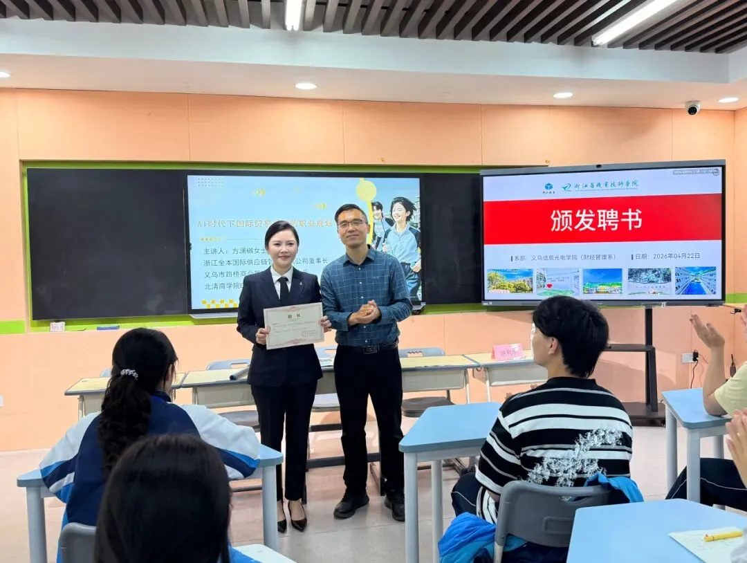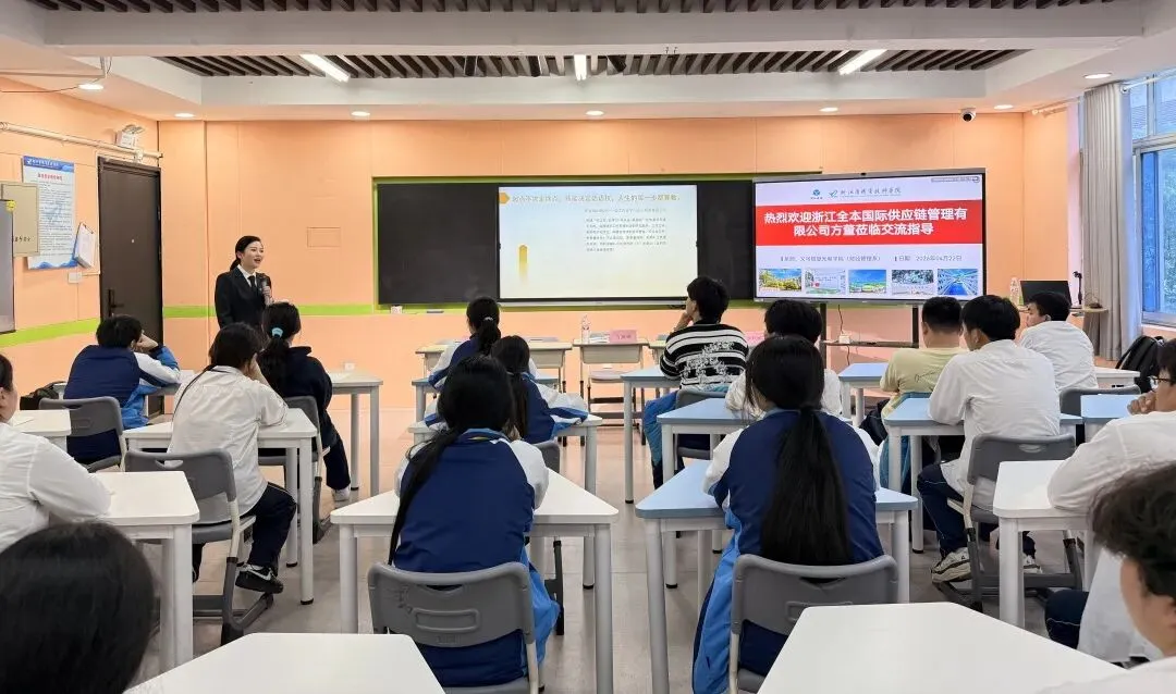 为深化产教融合、校企协同育人,精准对接行业前沿发展趋势,助力国贸专业学子明晰职业发展方向、夯实职场核心竞争力,近日,浙江省机电技师学院义乌信息光电学院财经管理系特邀浙江全本国际供应链管理有限公司董事长方澜樾女士莅临我校,开展专题讲座、课堂互动、校企座谈、人才培养研讨系列交流活动,以行业一线经验赋能专业育人全链条。
