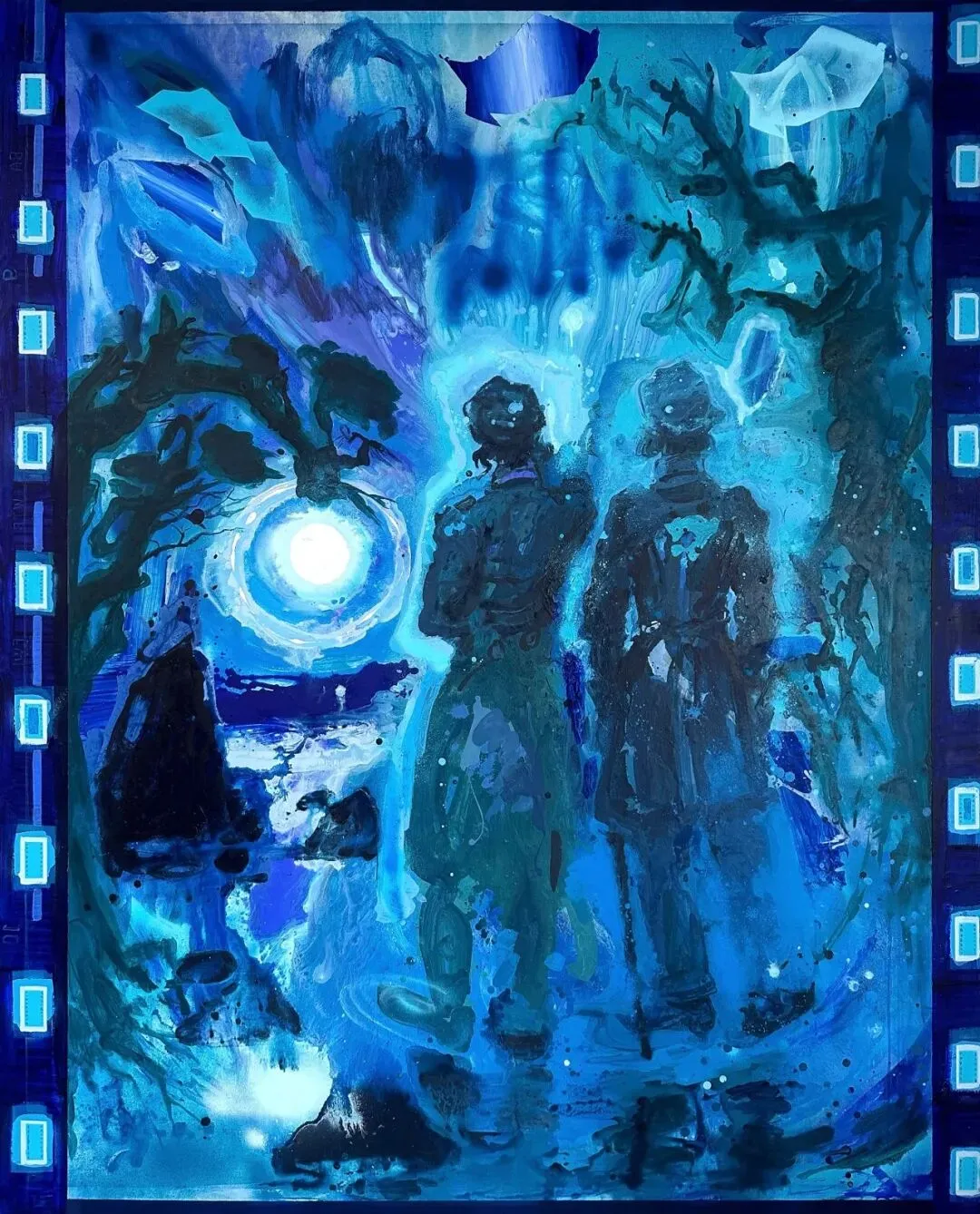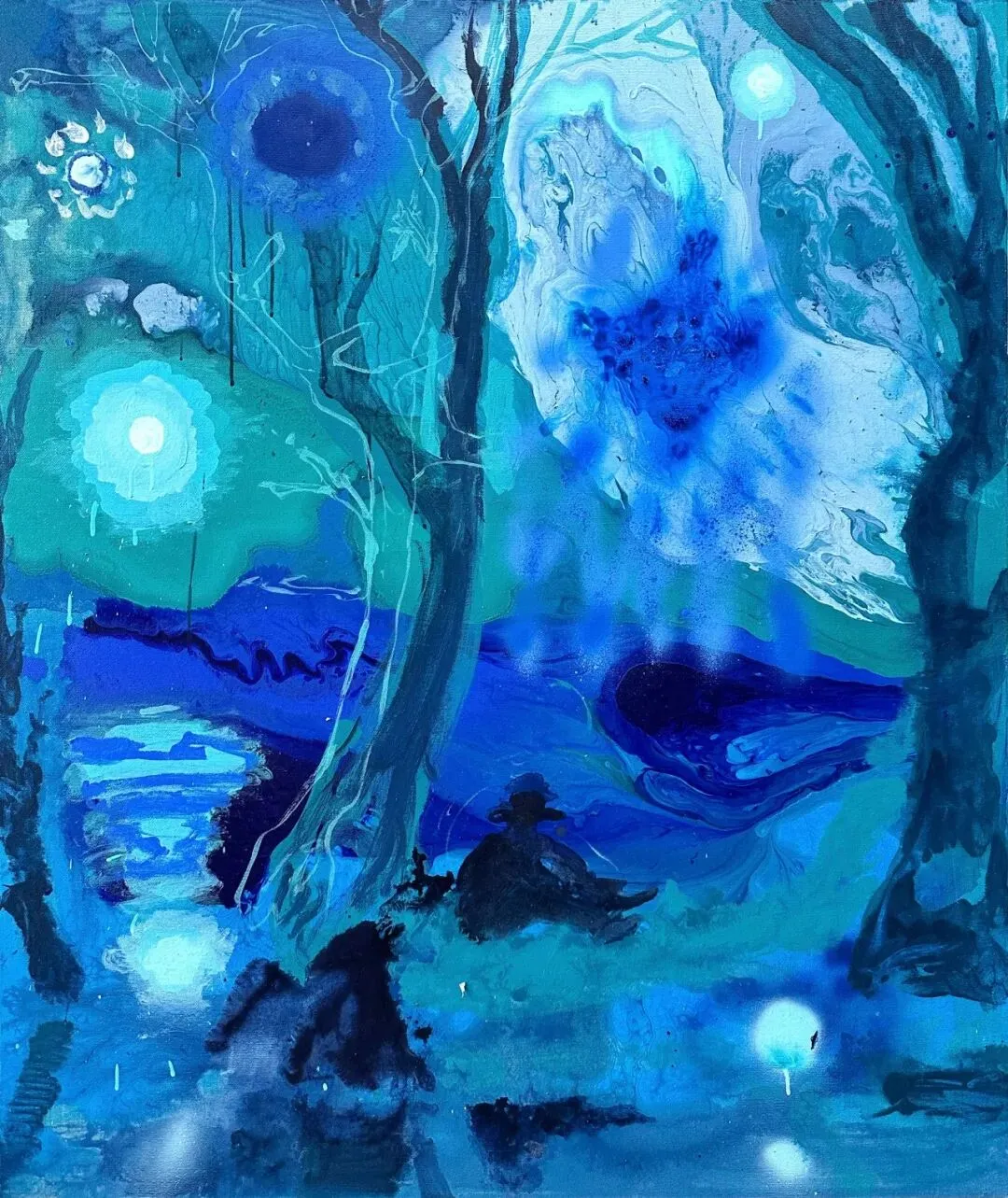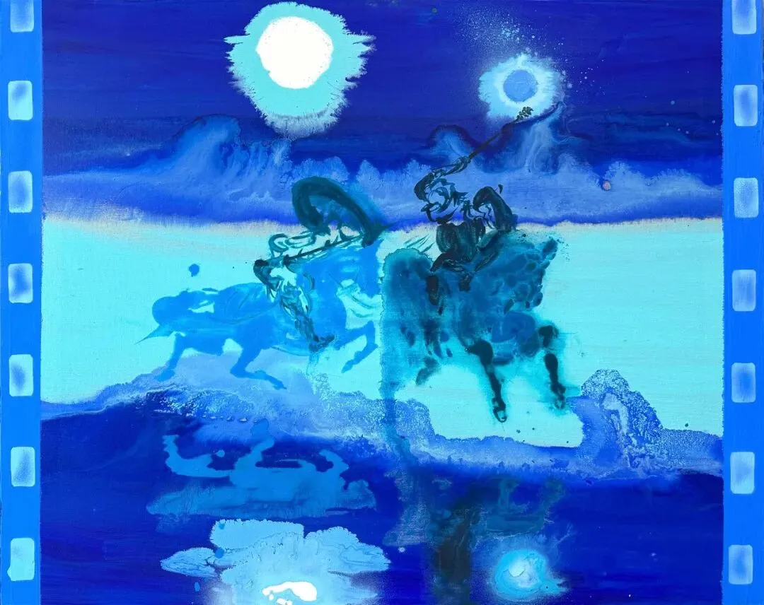 王太斌画面中的月光,恰好停在这个位置。夜晚的一切被看见需要一种媒介:月光落下来,蓝色便接住了它。月光让可见世界褪色,蓝色将褪去的部分收拢、沉淀,化为水面上的微光。这光足够微弱,足够遥远,倒影因此或许比实体更清晰。蓝色是那片水,足够深、足够静,倒影停住,永不沉没。在月光与蓝色之间,是一种默然的相互成全,月光借蓝色而得以驻留,蓝色因月光而变得可见。