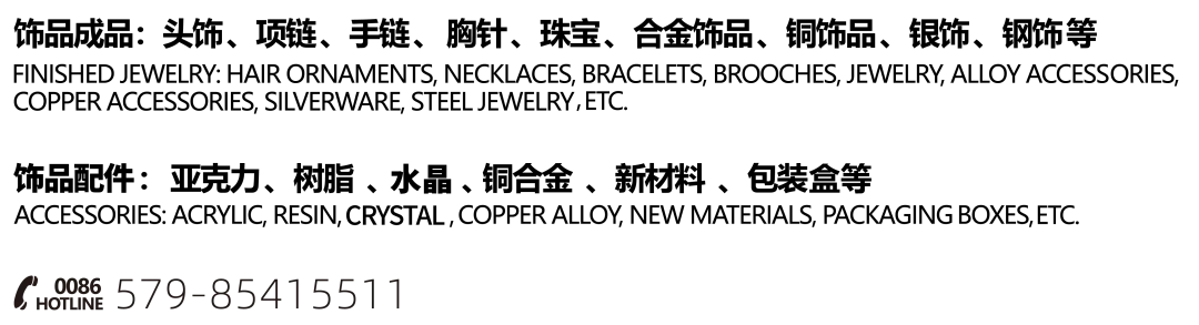 展品覆盖全品类饰品成品与配件辅料,包括头饰、项链、手链、胸针、银饰、合金饰品、铜饰、钢饰等成品,以及亚克力、水晶、树脂、环保新材料、包装设计等配套产品,一站式满足海内外采购商多元化采购需求。